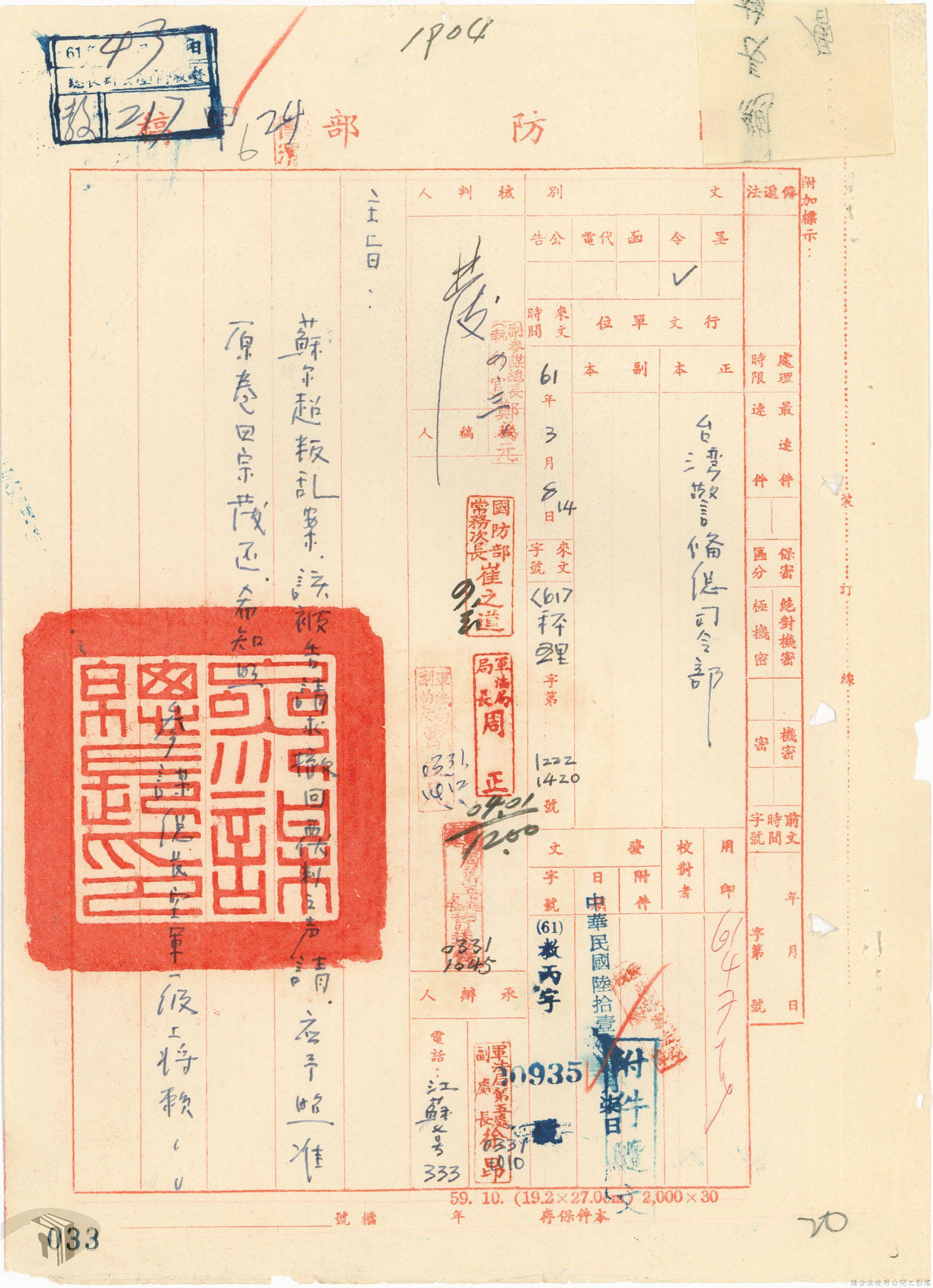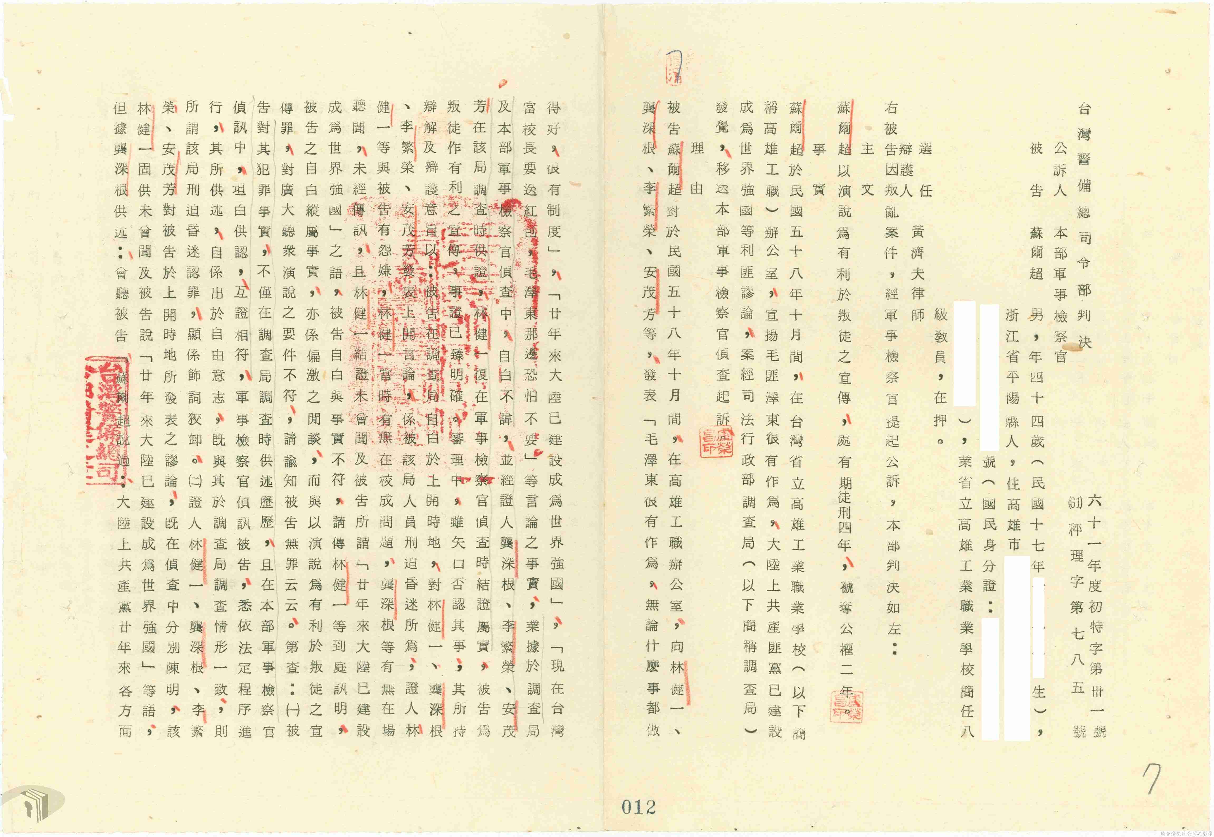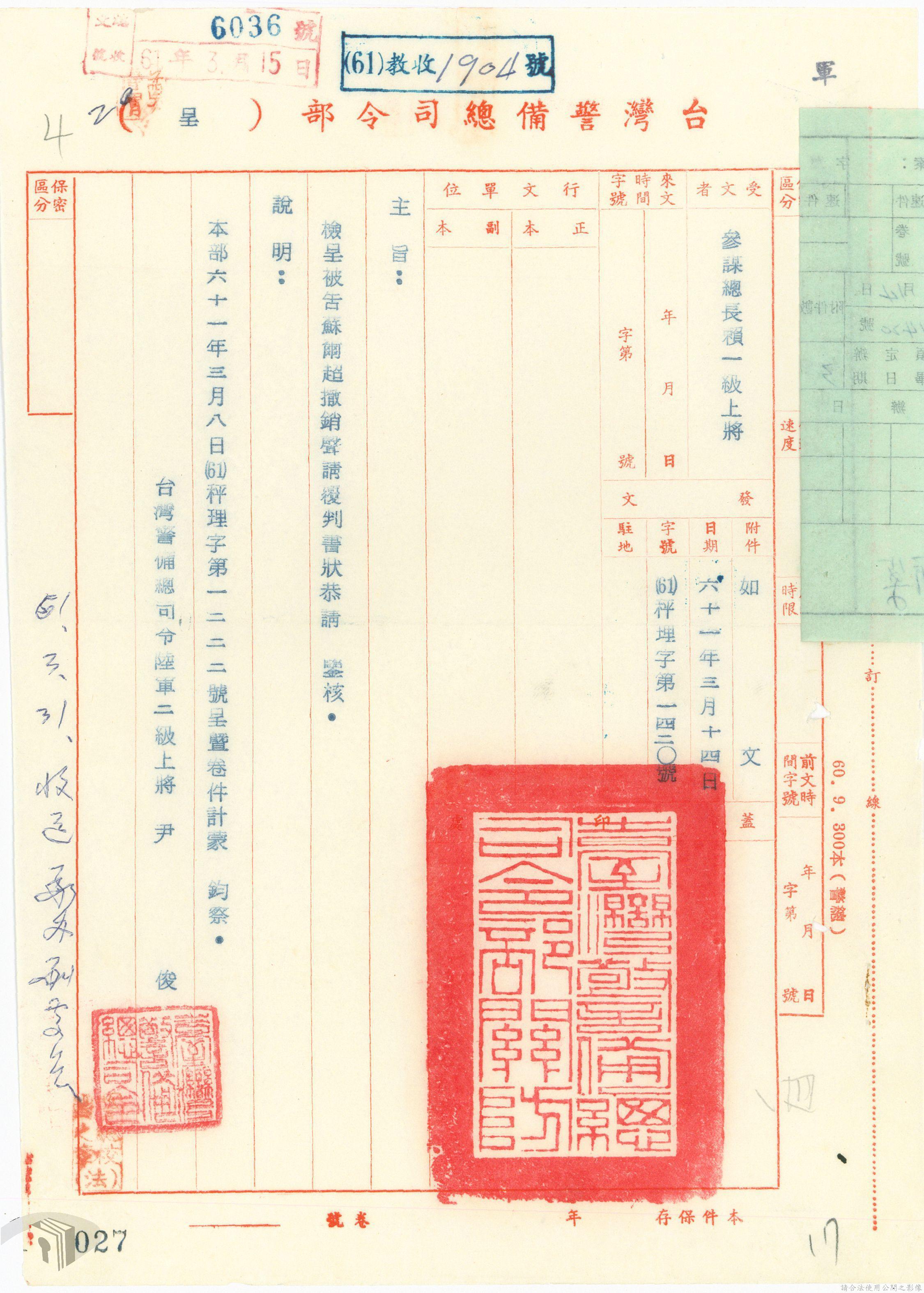 本案為61年間,省立高雄工業職業學校教員因案經臺灣警備總司令部審訊判決後,被告不服原判決而聲請覆判,臺灣警備總司令部轉陳覆判案給國防部,後被告放棄聲請覆判,經國防部覆判庭核准被告撤銷其覆判之聲請,警備總部檢陳被告撤銷聲請覆判書給國防部。附臺灣警備總司令部判決書、聲請覆判書等文件資料。