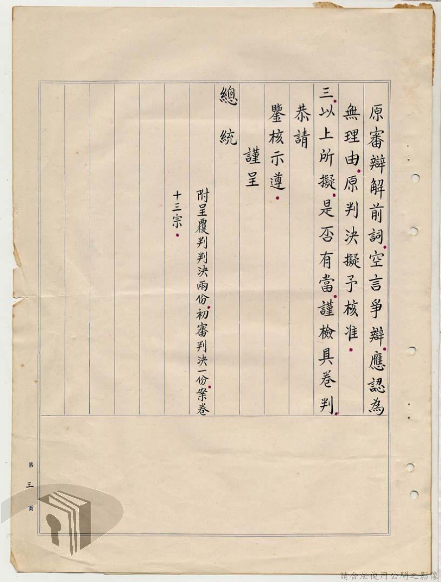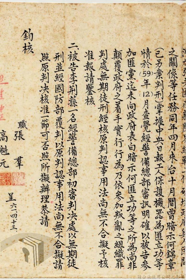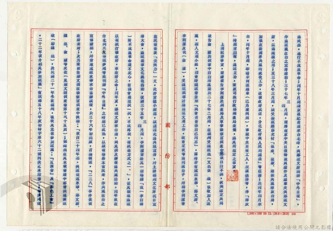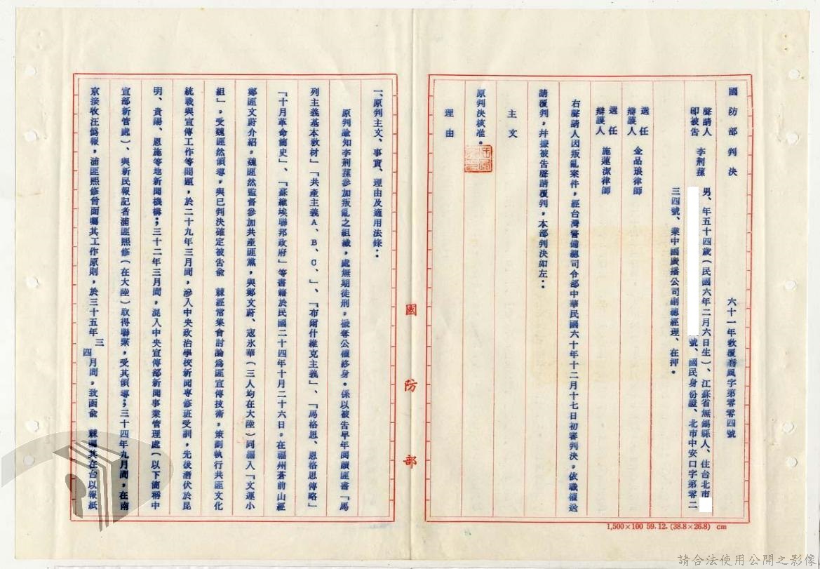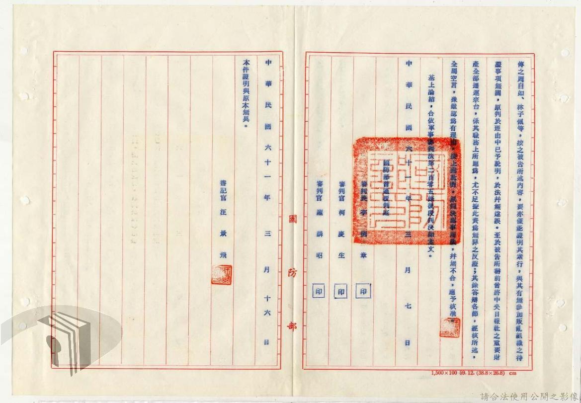 本案為61年間,國防部呈報總統有關中國廣播公司副總經理因為涉及案件經臺灣警備總司令部初審判決,後當事人依職權送請再次判決,獲國防部原判決核准的覆判結果,後獲總統回復同意。附判決書等相關文件資料。