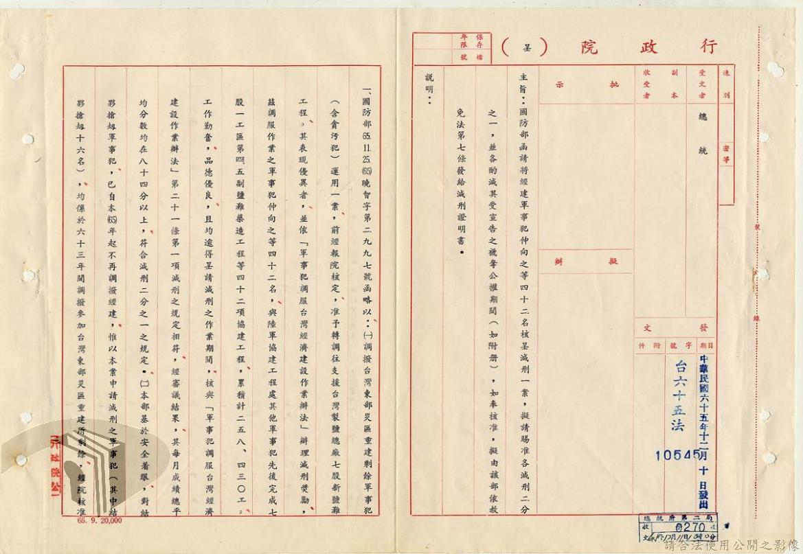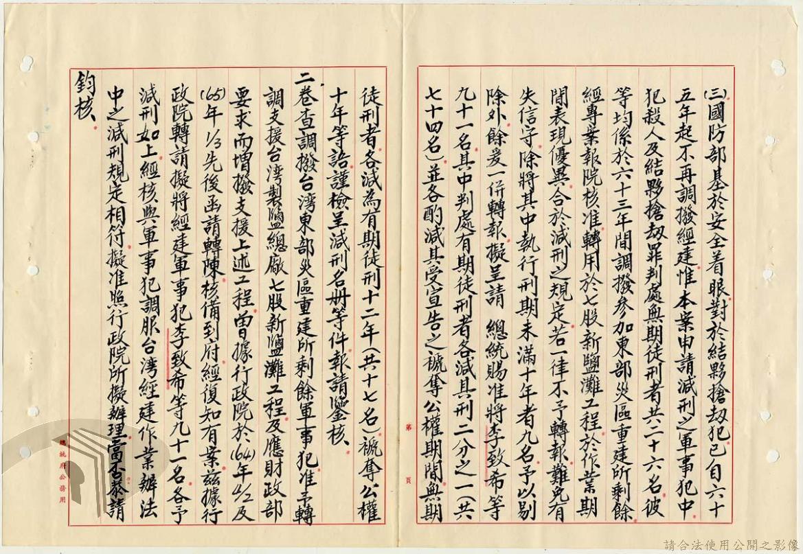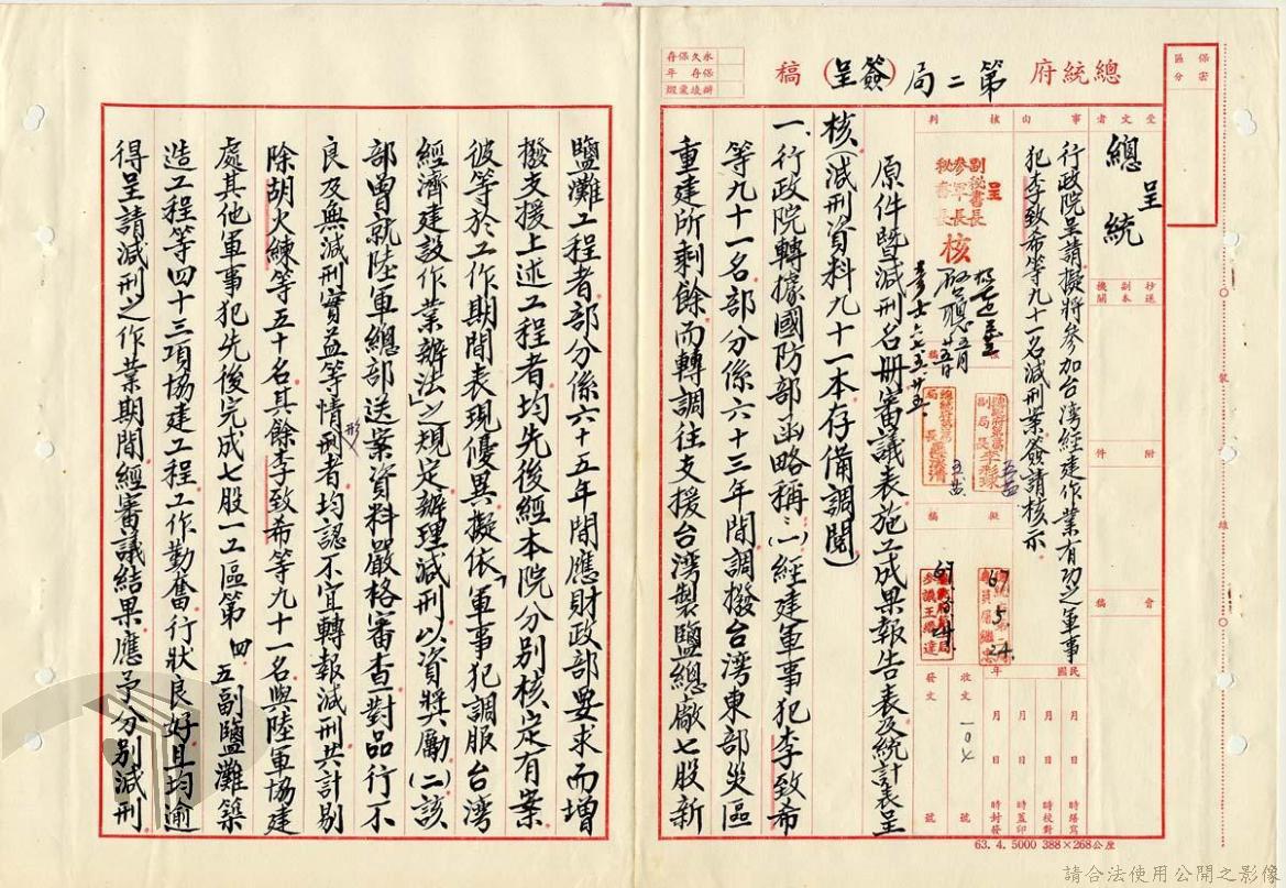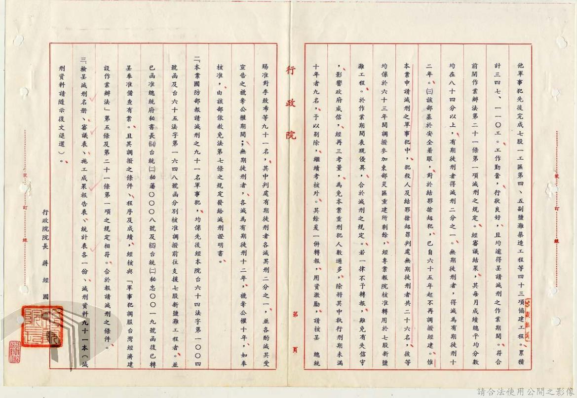 本案為62至68年間,行政院呈報總統有關國防部因為多位受刑人參加臺灣經濟建設作業,工作勤奮、品德優良等原因的關係,陳請讓他們減刑,後獲總統府回復同意辦理。附申請減刑名冊、申請減刑審議報告表、成果報告表等文件資料。