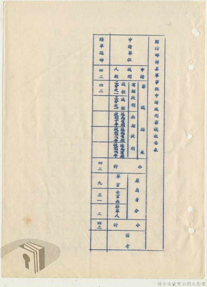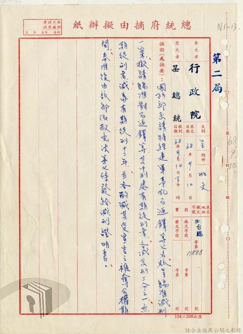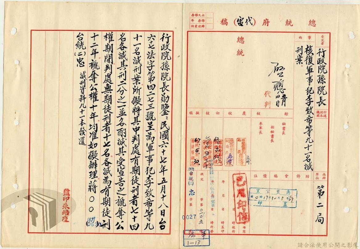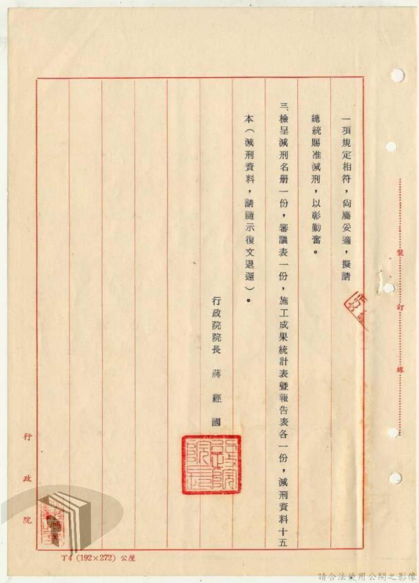本案為62至68年間,行政院呈報總統有關國防部因為多位受刑人參加臺灣經濟建設作業,工作勤奮、品德優良等原因的關係,陳請讓他們減刑,後獲總統府回復同意辦理。附申請減刑名冊、申請減刑審議報告表、成果報告表等文件資料。