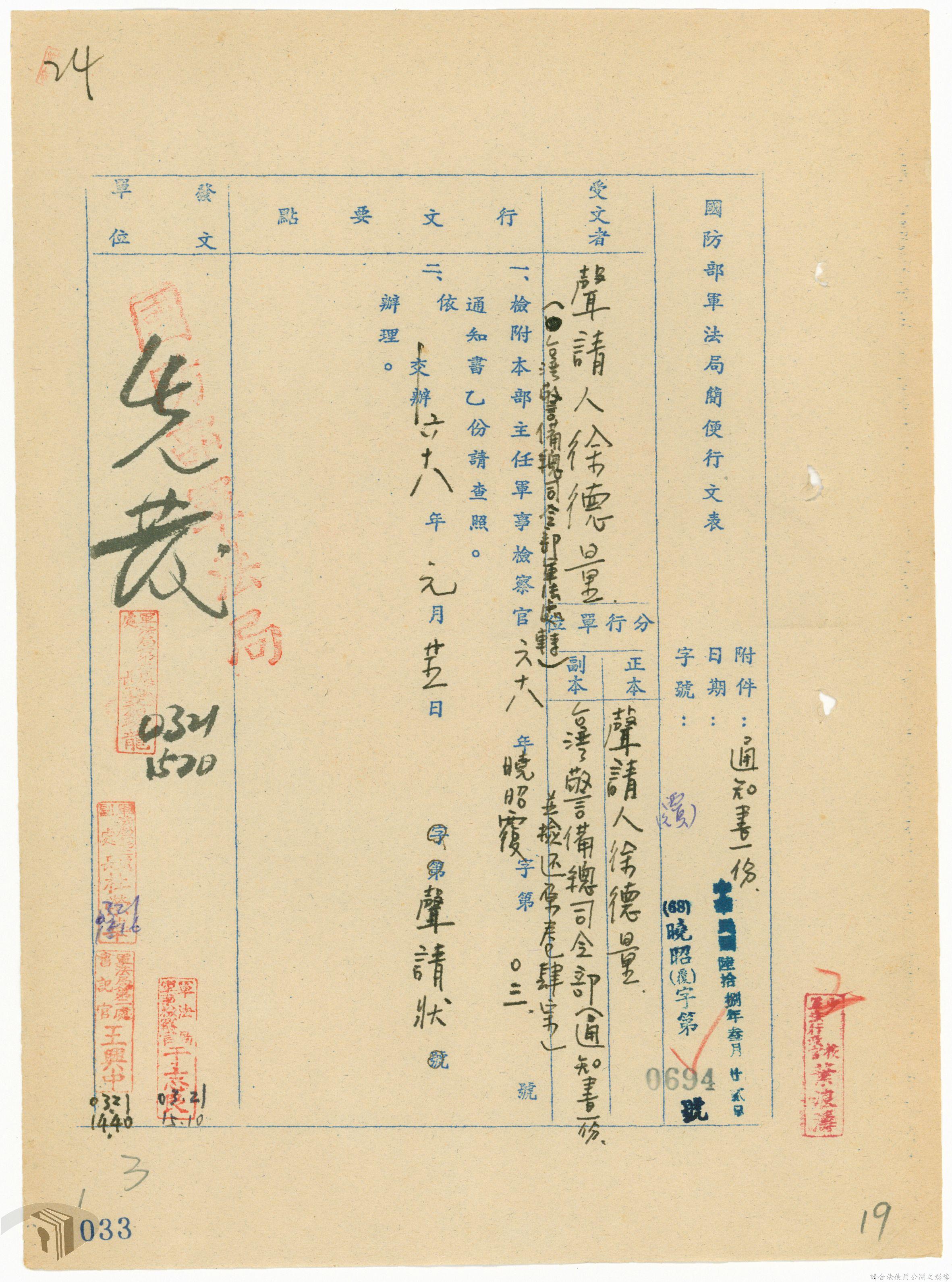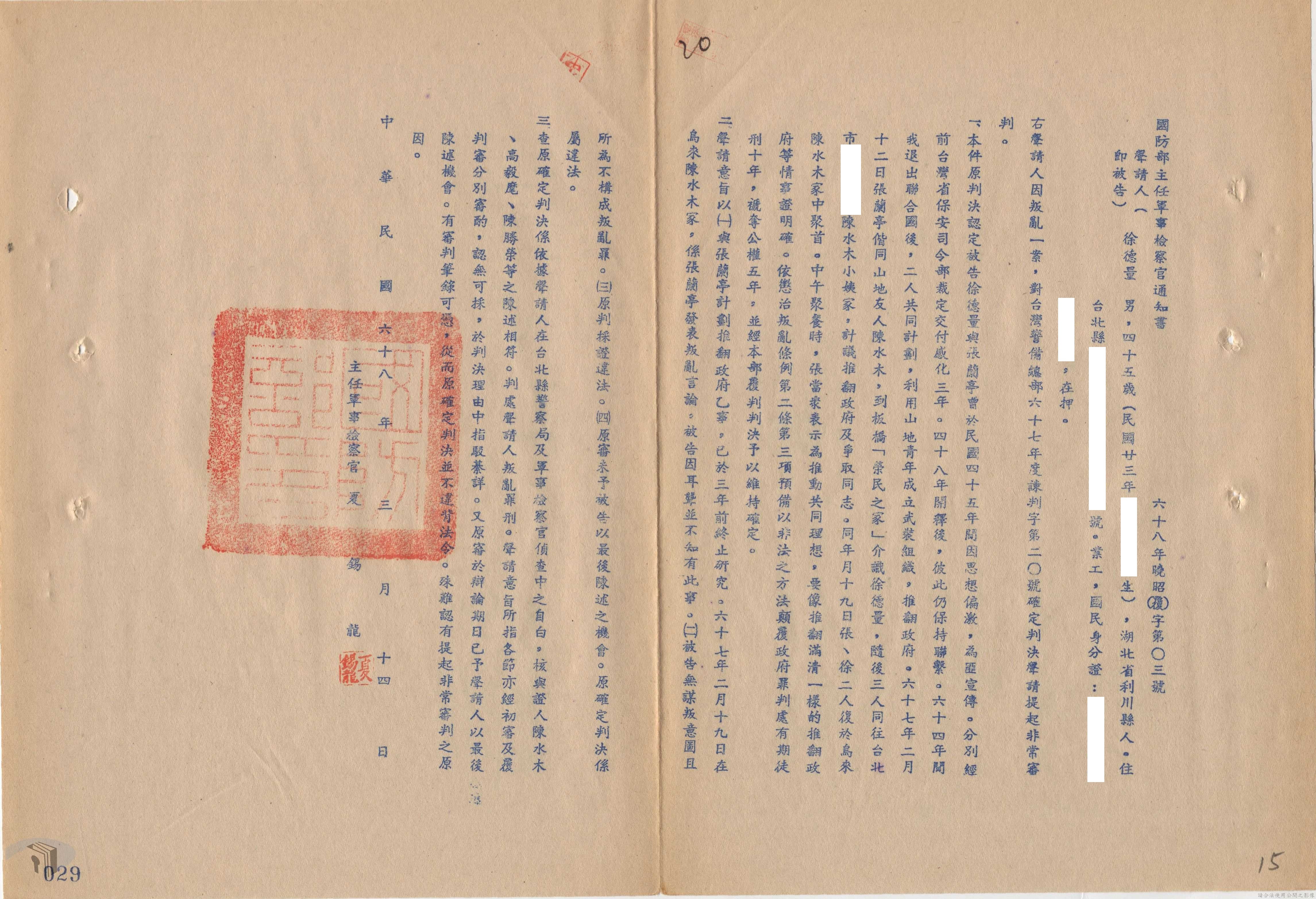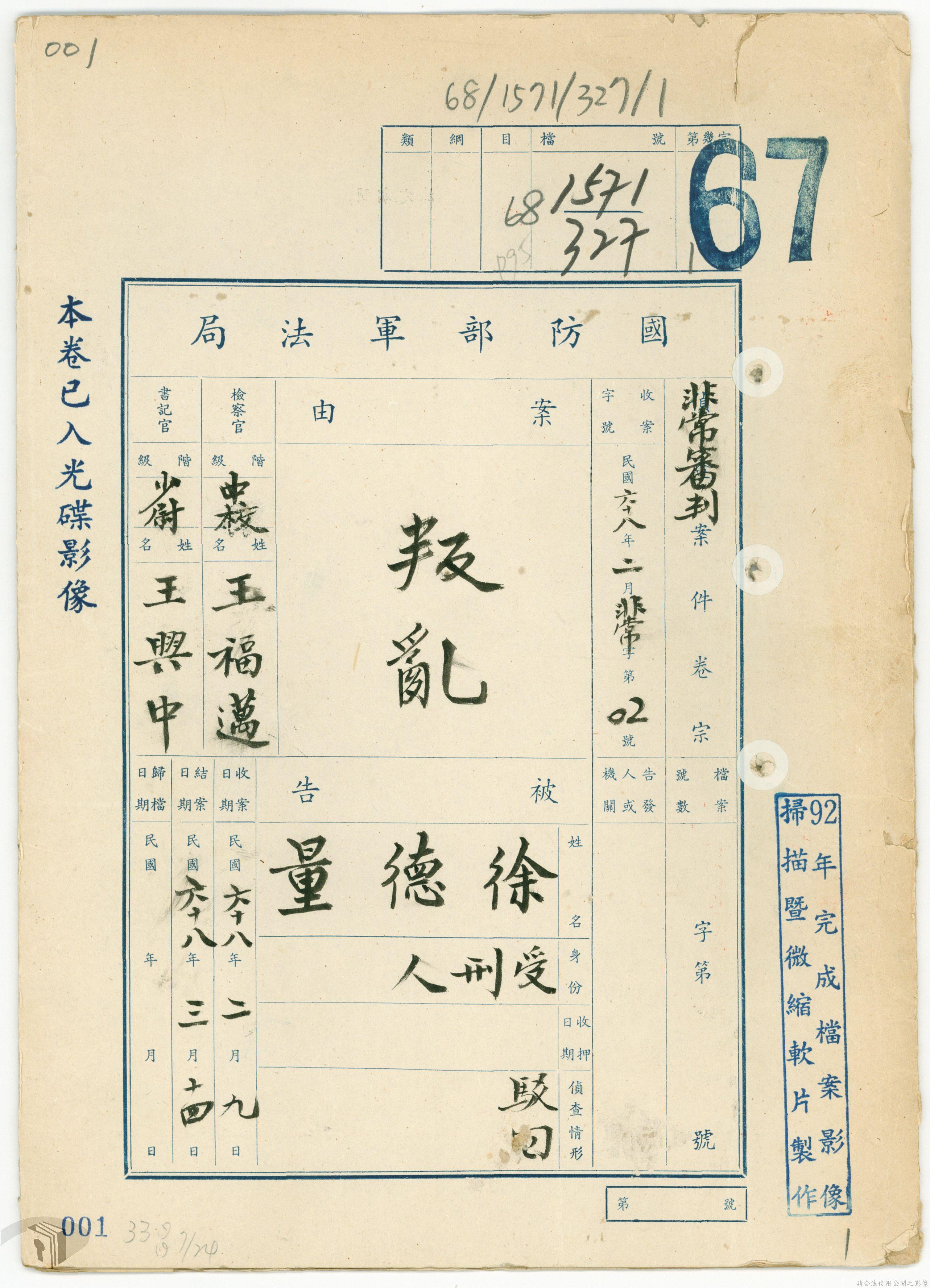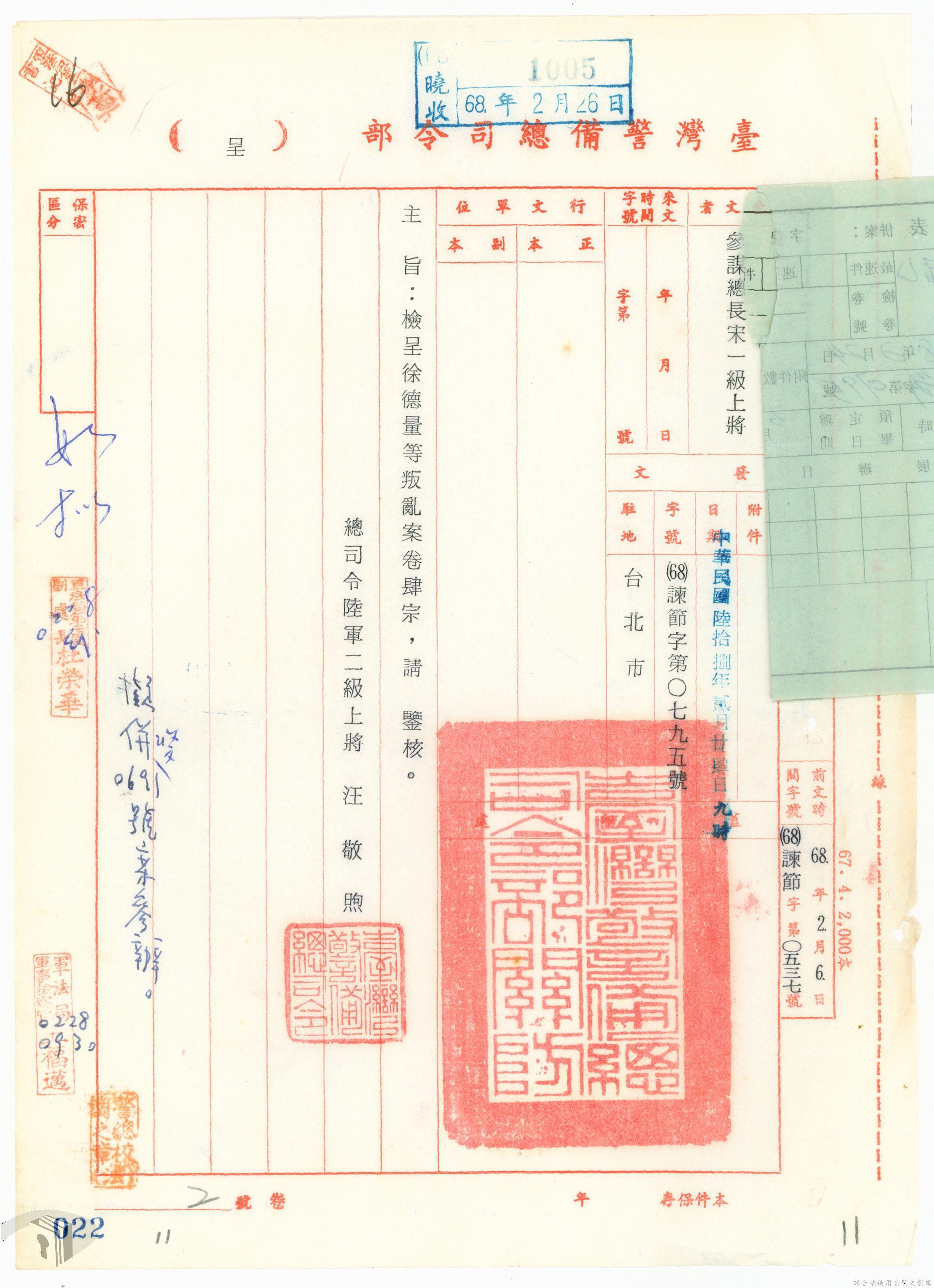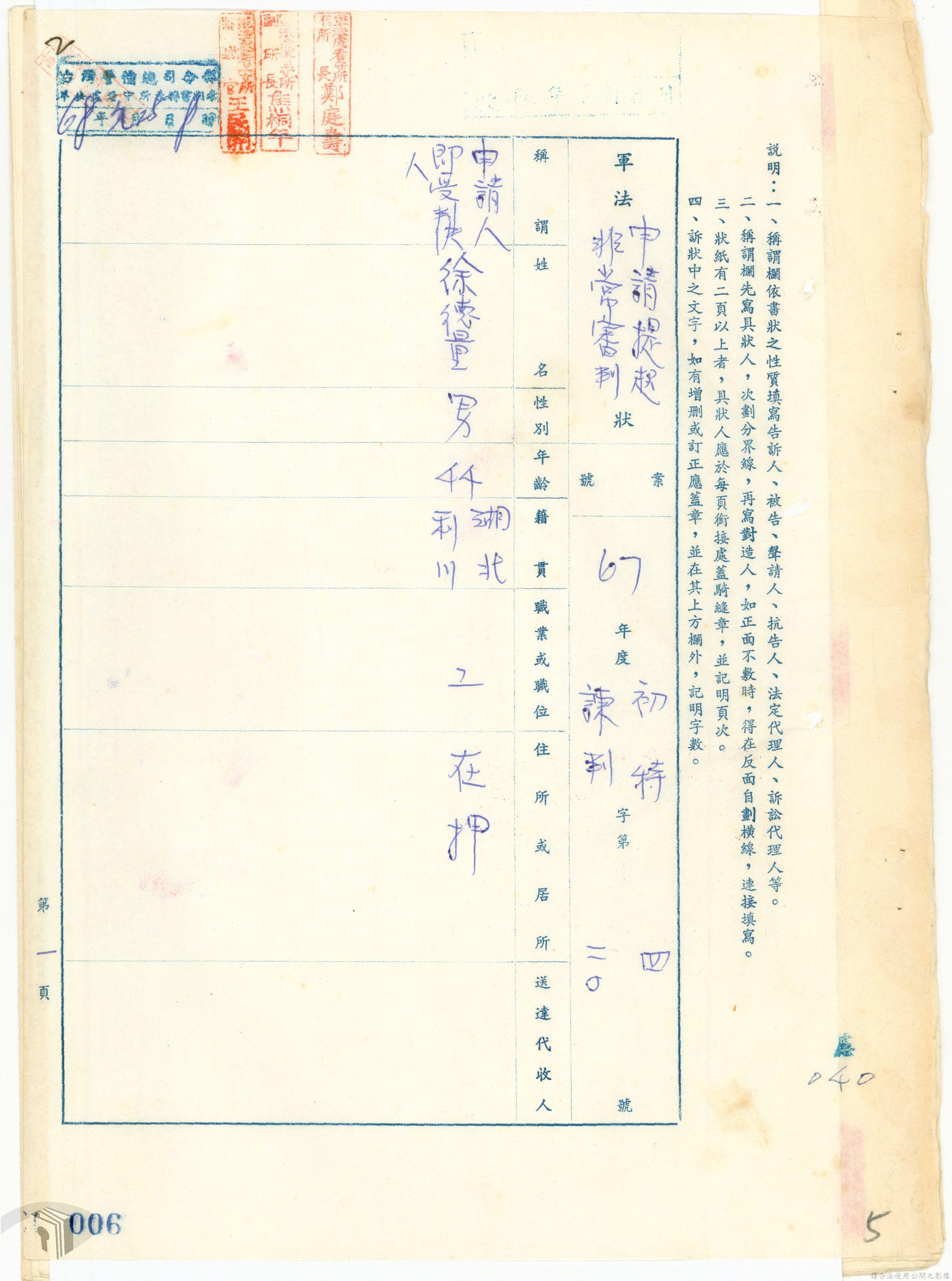 本案為68年間,工人因案經臺灣警備總司令部審訊判決後,被告不服原判決聲請非常審判,臺灣警備總司令部轉陳被告聲請非常審判案給國防部,經國防部予以駁回。附臺灣警備總司令部判決書、軍法聲請提起非常審判狀、國防部主任軍事檢察官通知書等文件資料。