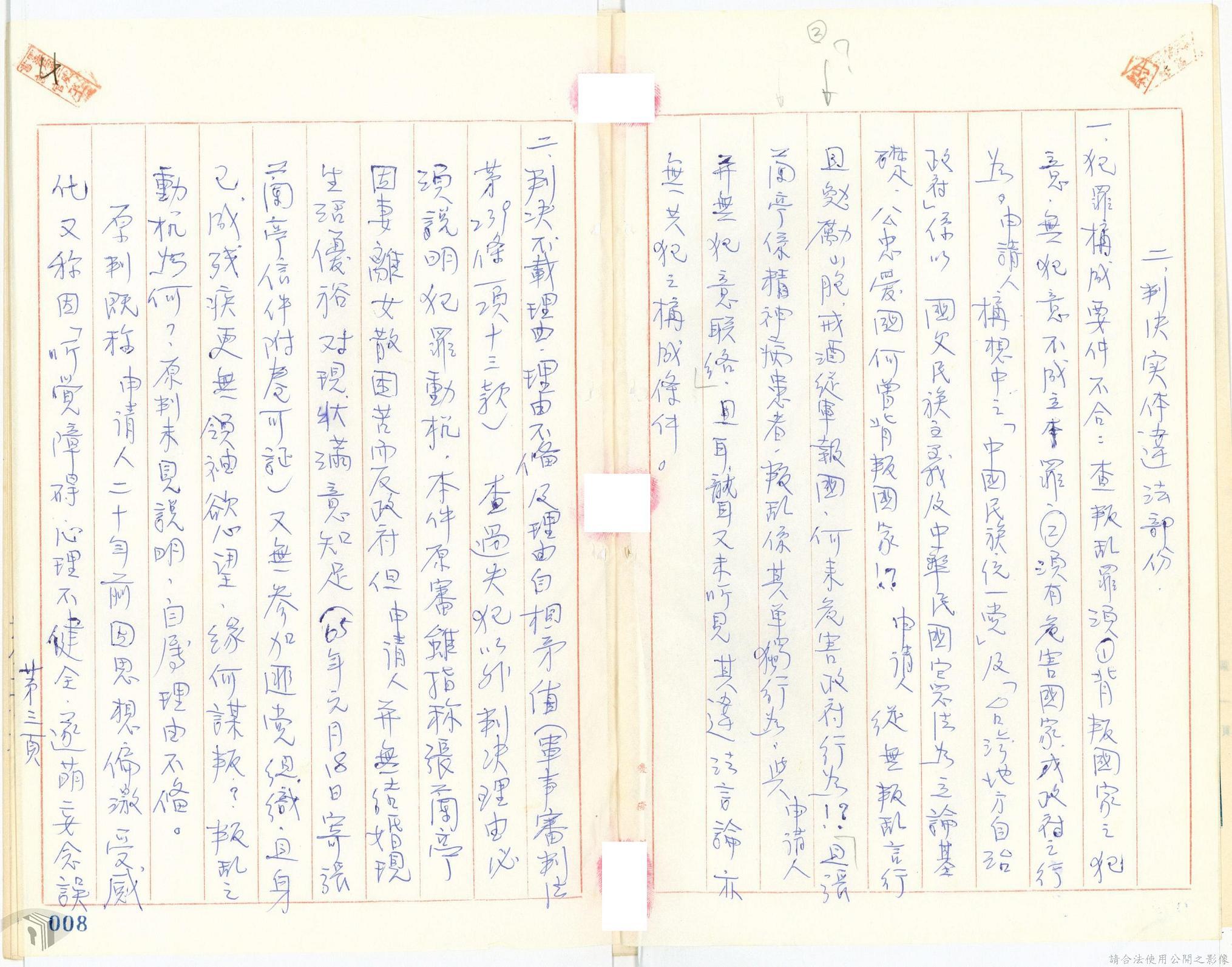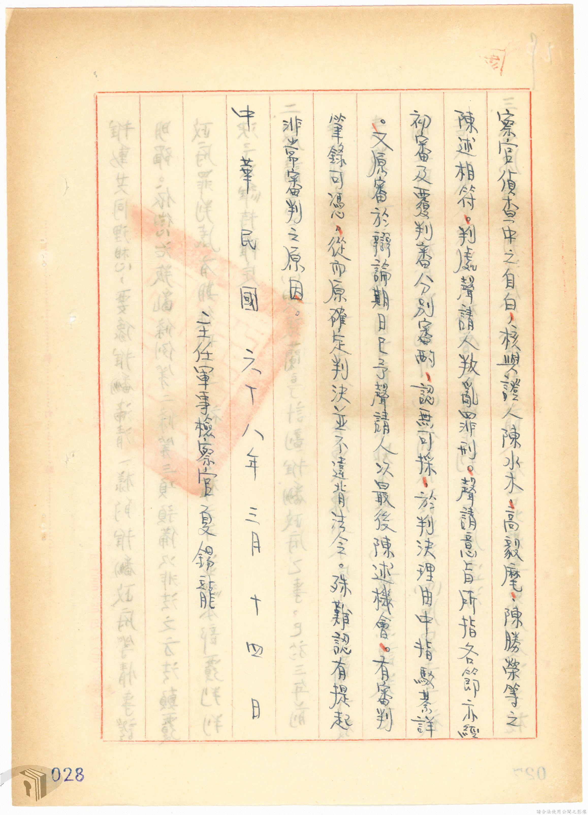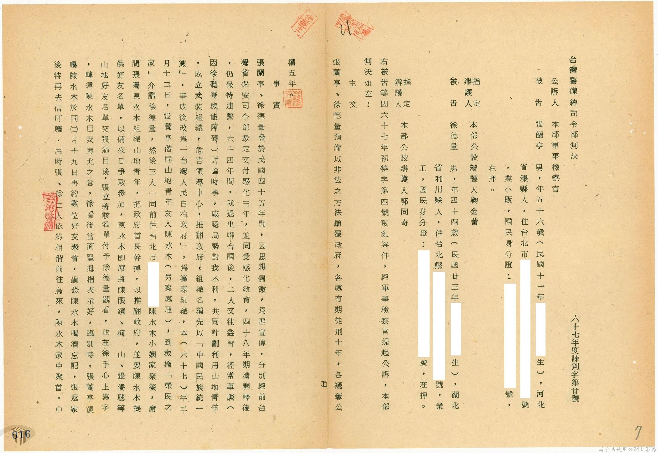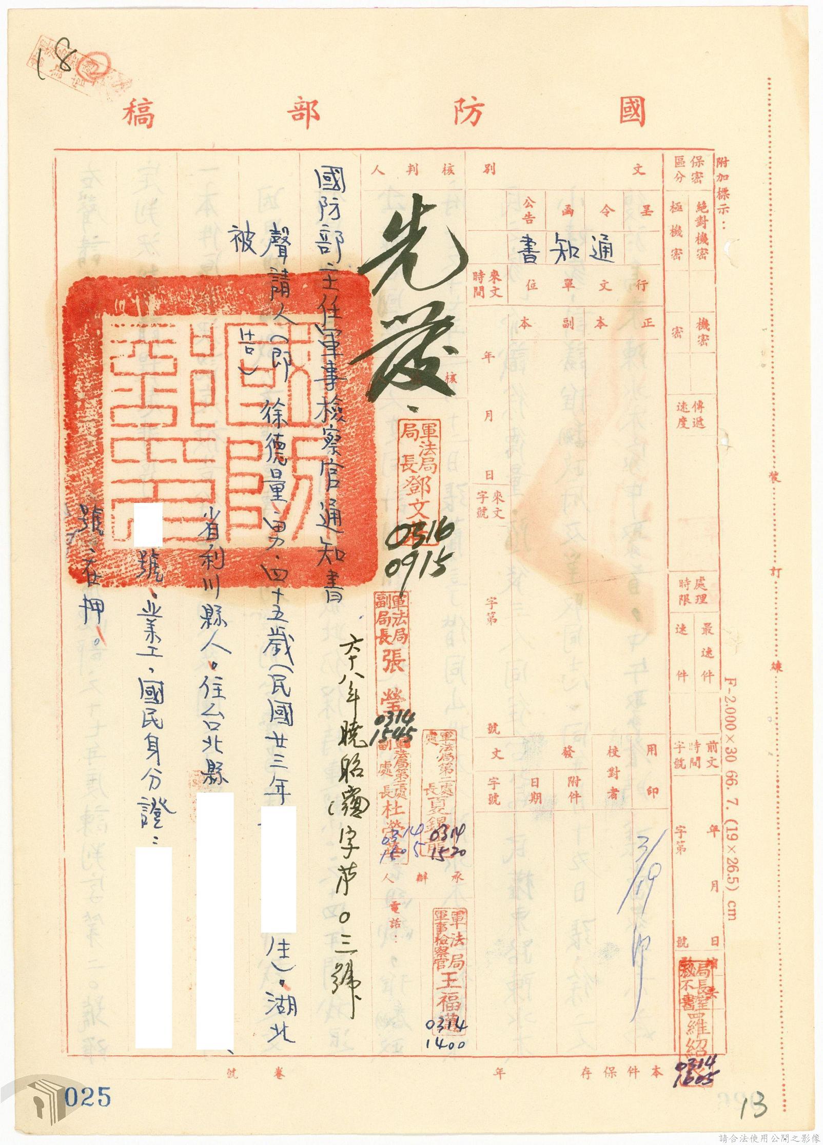 本案為68年間,工人因案經臺灣警備總司令部審訊判決後,被告不服原判決聲請非常審判,臺灣警備總司令部轉陳被告聲請非常審判案給國防部,經國防部予以駁回。附臺灣警備總司令部判決書、軍法聲請提起非常審判狀、國防部主任軍事檢察官通知書等文件資料。