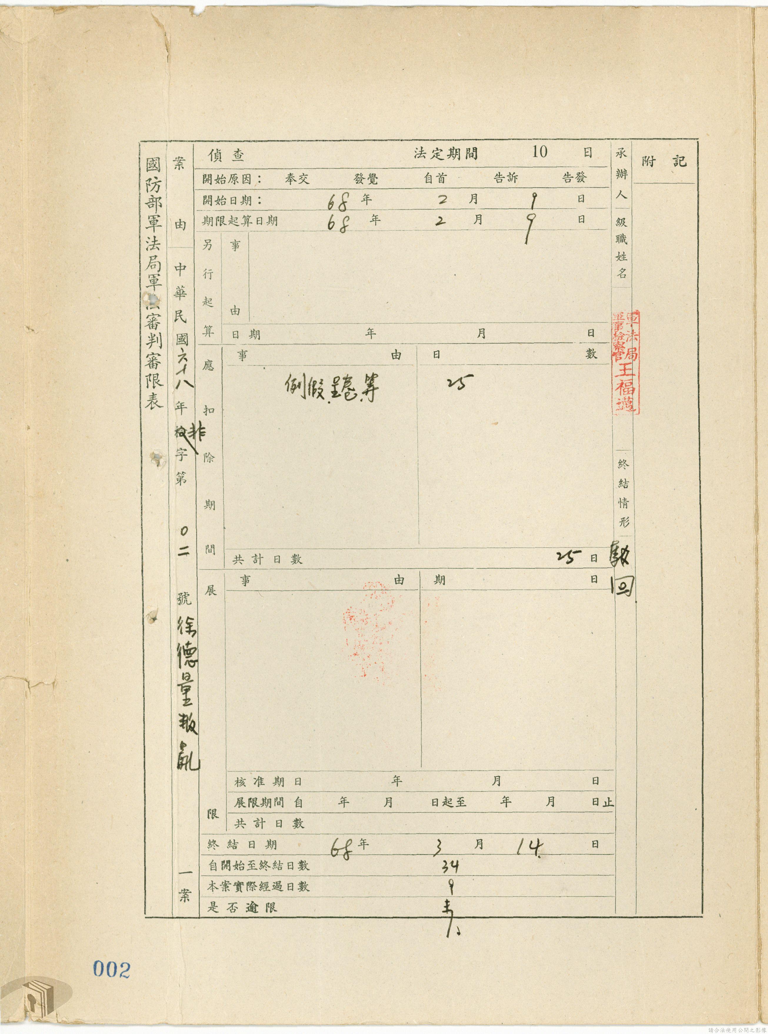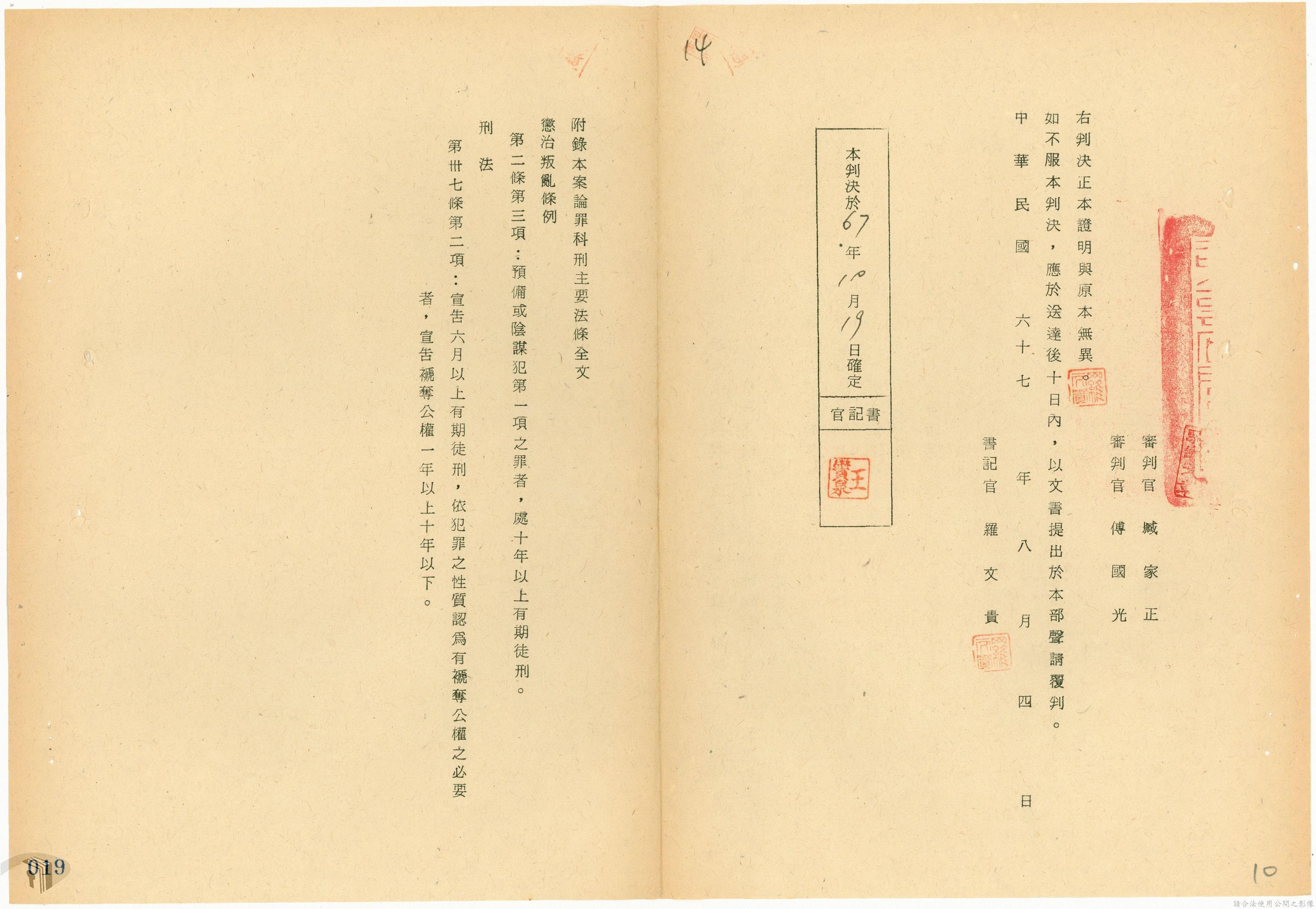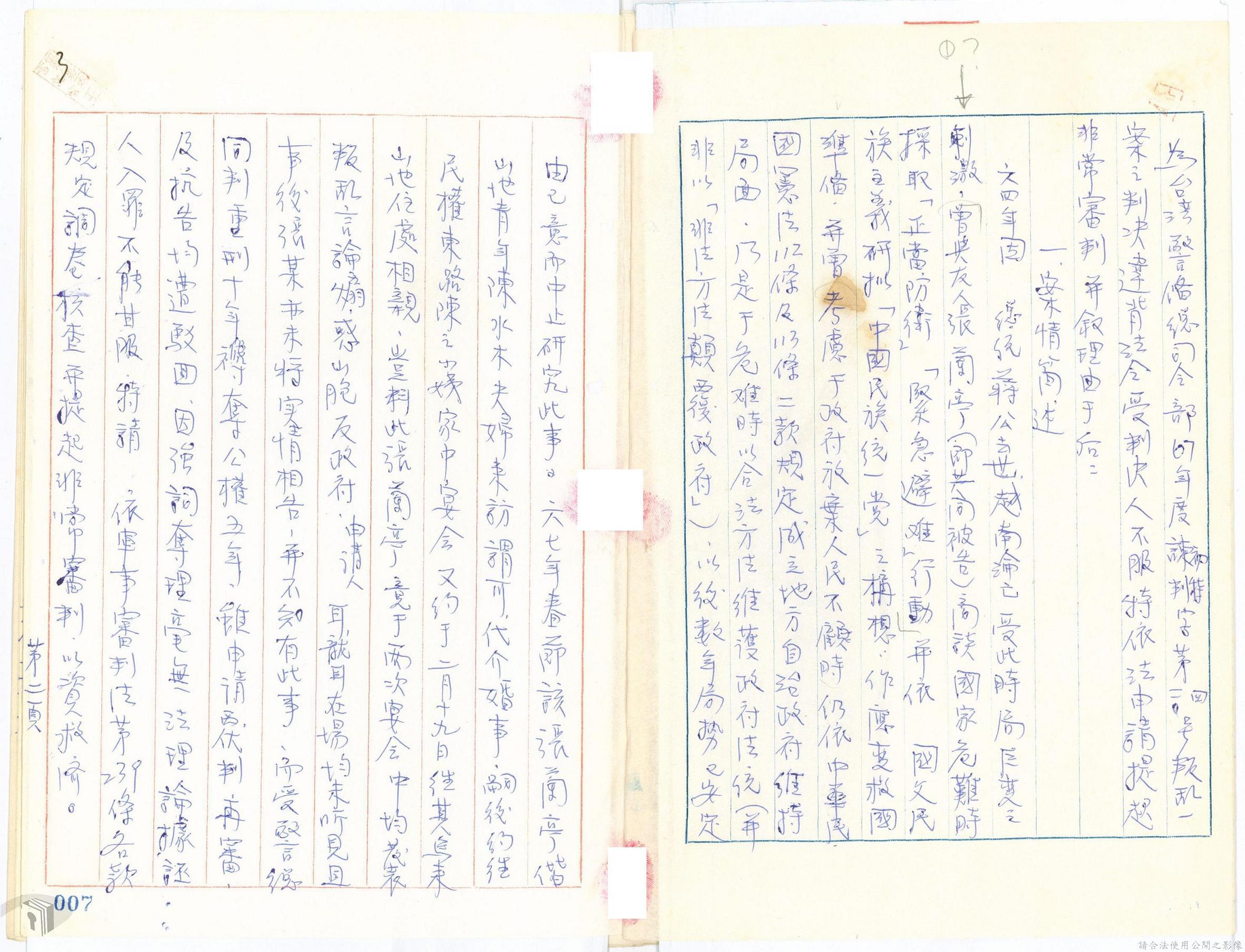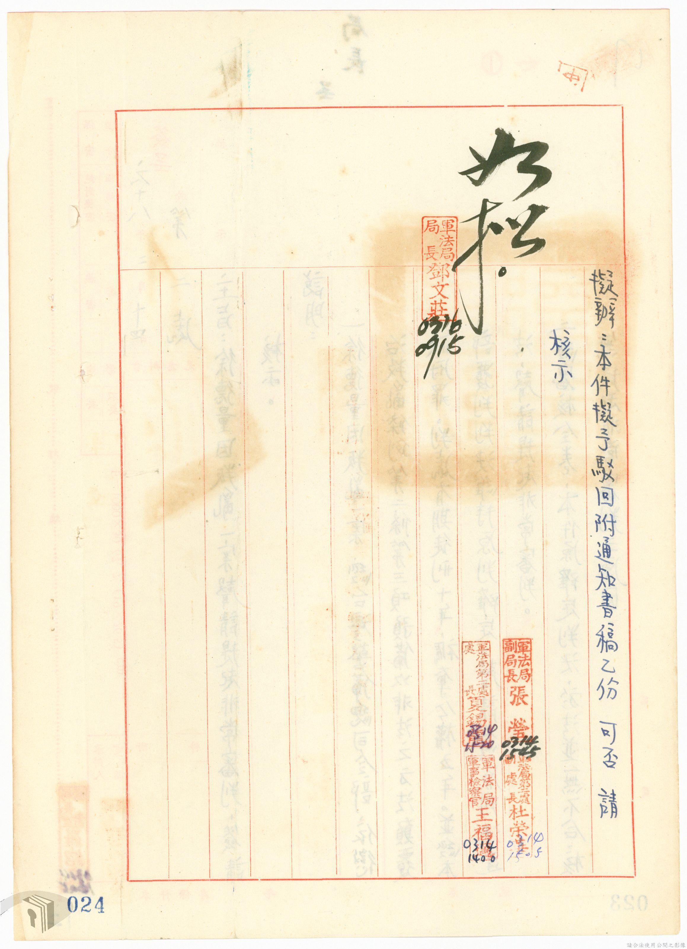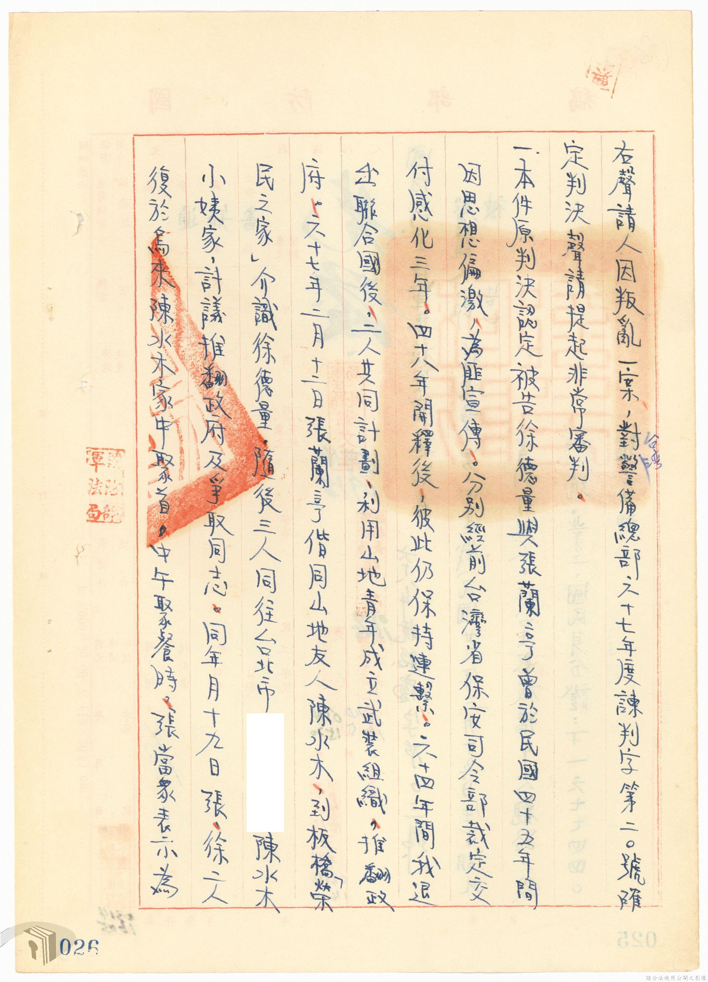 本案為68年間,工人因案經臺灣警備總司令部審訊判決後,被告不服原判決聲請非常審判,臺灣警備總司令部轉陳被告聲請非常審判案給國防部,經國防部予以駁回。附臺灣警備總司令部判決書、軍法聲請提起非常審判狀、國防部主任軍事檢察官通知書等文件資料。