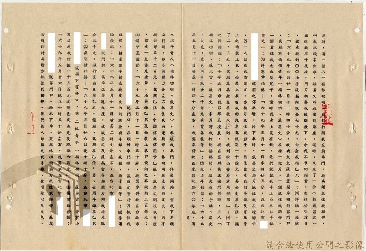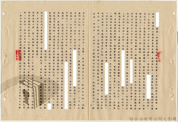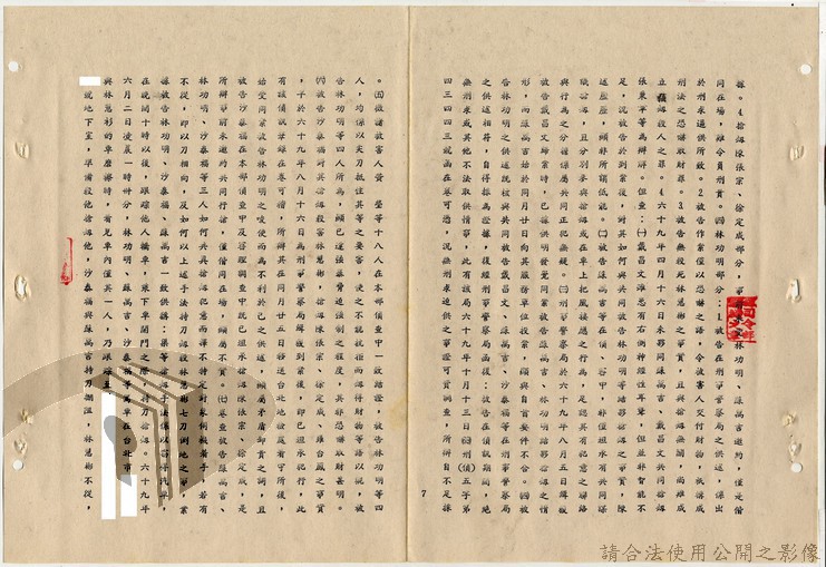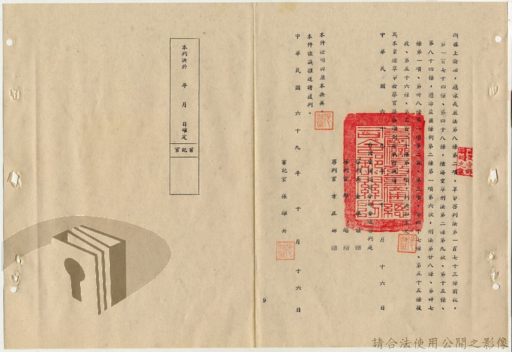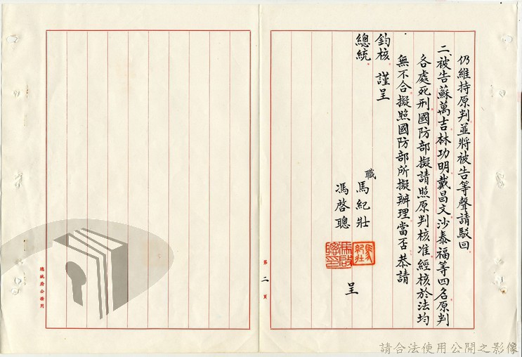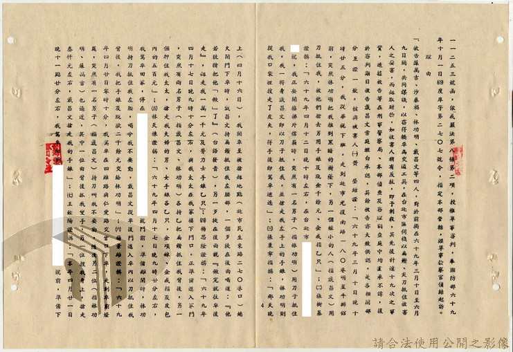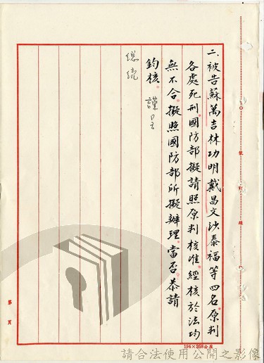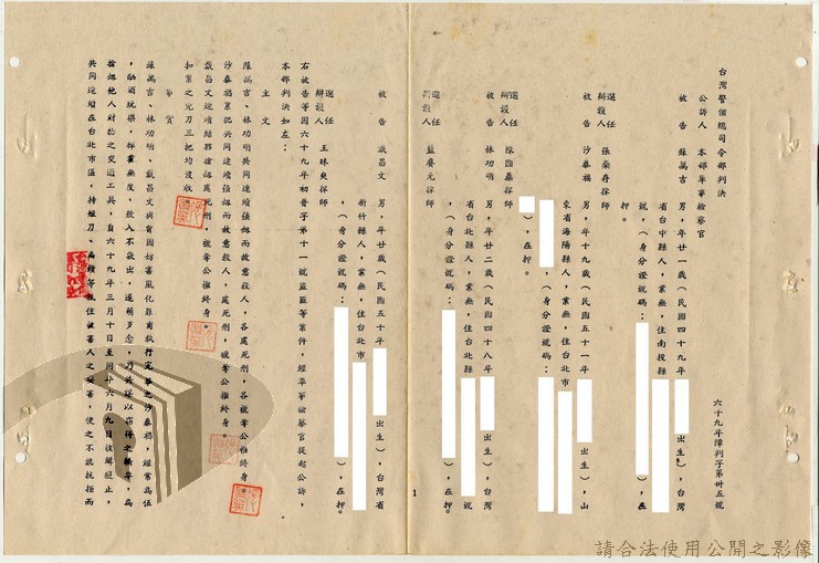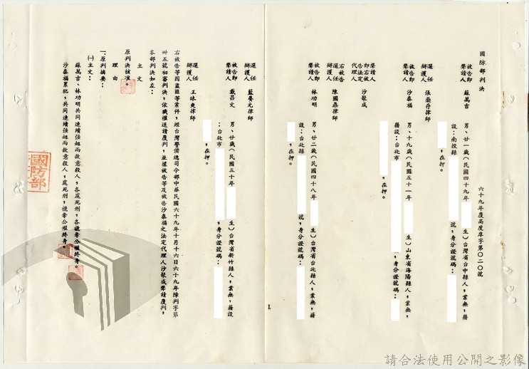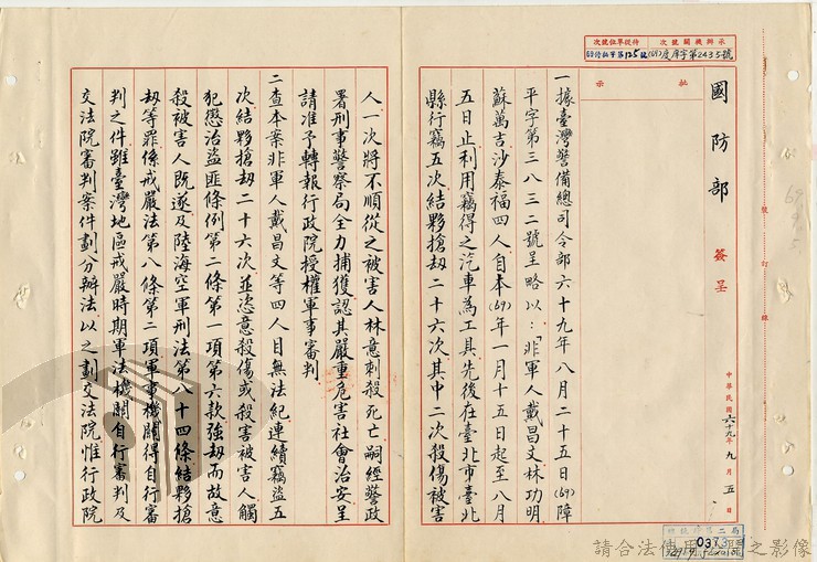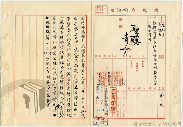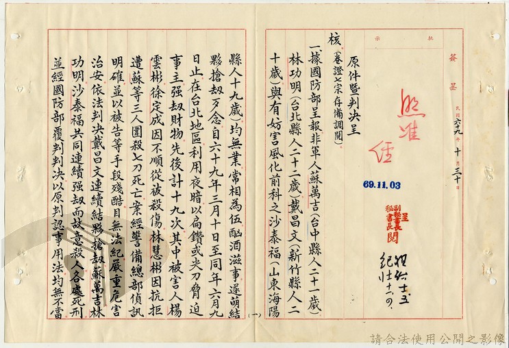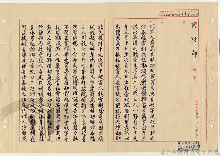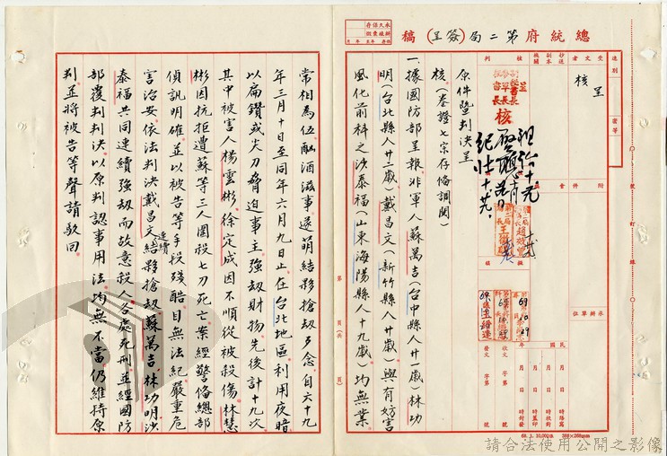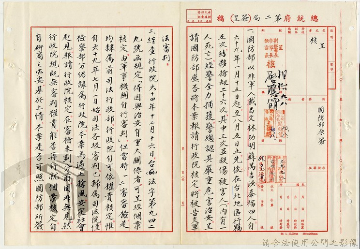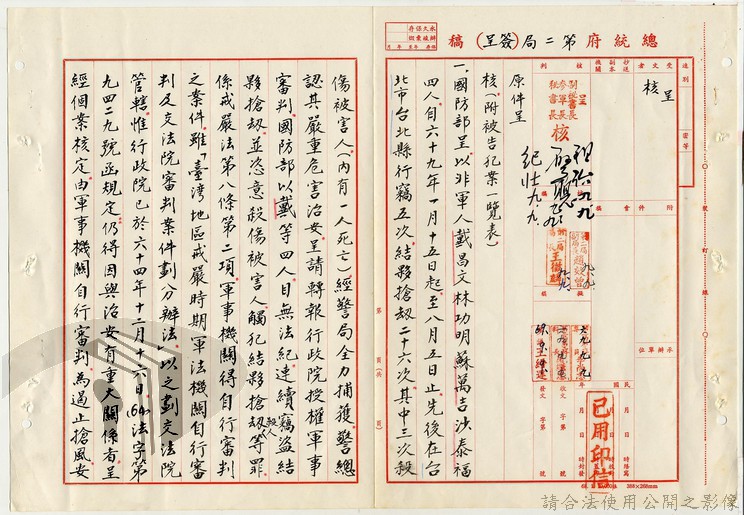本案為69年間,國防部向總統呈報有關臺灣警備總司令部陳請國防部轉報行政院將民眾涉及的案件授權警總軍事審判,獲總統府第二局回復同意辦理,今後如有類似此情節的重大刑案,均交由軍事審判,後國防部呈報總統有關民眾涉案情形、判決結果、審理建議等,獲總統府回復辦。