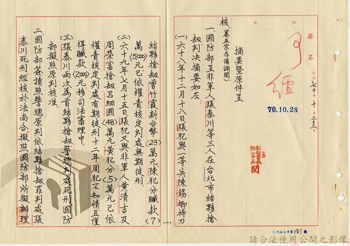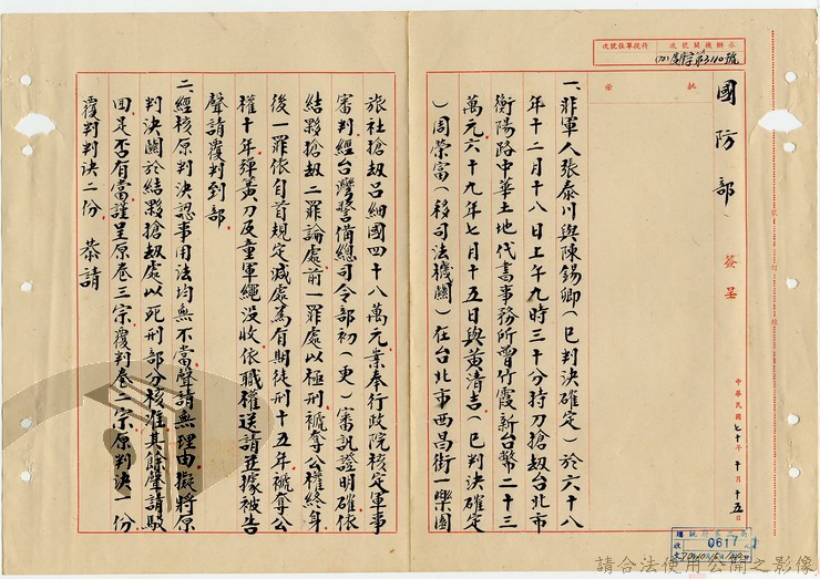 本案為70年間,國防部向總統呈報有關民眾涉案情形,和當事人獲臺灣警備總司令部判決後送請覆判,獲國防部原判決部分核准、其餘聲請駁回的覆判結果,及該部審理建議,後獲總統府回復辦理意見。附國防部判決書、臺灣警備總司令部判決書。