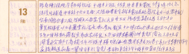 此為吳三連寫於 1978 年 1 月 13 日之日記。上午吳三連先接待至吳府訪問的李月和與藍田,後赴上班,接到吳修齊(即吳修身)、中本、張寶樹秘書長等人相繼來電。張寶樹通知吳三連蔣經國院長將於 21 日參觀台南關係企業工廠,並轉告吳氏陳誠夫人舉辦宴會之邀請以及湯有榮宴客改期。後與尊賢等人一同於淡水散步,三時結束後返家,下午接待來訪之楊蘭洲,商討1月19日召開之董事會事宜。晚間,參加送行陳永森返回日本的宴會。   日記本文提及之陳永森,是吳三連夫人李菱之二舅,雖年紀較吳氏輕但輩分高,吳三連依然隨夫人稱呼陳永森為二舅。陳永森為台南人,留學日本後常居該地,潛心習藝十三年,除膠彩畫外,精通各樣技藝包括油畫、工藝等。曾二次奪下日本白壽賞,為該獎項第一位非日籍人士得獎者,是台灣藝術史上重要的台籍旅外藝術家。陳氏留學期間無家庭後援,學業工作有時無法兼顧,蔡培火、吳三連、李菱等人知曉後,給予其鼓舞與實際支持,吳三連並替其出資部分學費。 1935 年陳永森搬入吳三連於東京的寓所,吳氏甚至借出約八疊大的空間給予陳永森作畫室,不遺餘力地支援其在日本學藝。後吳三連遷居至天津,陳永森仍居於該處,並在此十多年間完成了大量作品,直至二戰期間寓所被炸毀為止。