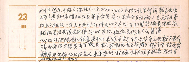 此為吳三連寫於 1978 年 2 月 23 日之日記。吳三連上午先至環球辦公,中午赴林口俱樂部主持幹事會,會議主軸為增加基本會員以取得資金供擴建球場與清償債務。午後,接待吳豐山來訪錄音編作《回憶錄》。後出席自立晚報主筆會議,會中論及謝主席競選副總統之事與今後閣揆人選,會畢接待陳信貞與詹懷德母子來訪。   日記本文內提及之《回憶錄》為《吳三連回憶錄》。此書由吳豐山替吳三連整理口述之錄音寫成,出版於1991年。全書錄音分作二階段,分別為1977年至1978年間與1985年間,兩階段相隔約七年,而本日記的寫成則是在第一段錄音期間。在錄音完成後,中研院口述歷史小組曾希望出版吳三連的一生經歷,然吳豐山請示吳三連以後,吳三連仍希望吳豐山能獨力完成,再送中研院備考。只是吳豐山接手自立晚報社長後工作甚多,導致撰寫時間一再延宕,最終在協辦好吳三連喪事以後,於1989年正式開始整理撰寫,歷時一年半方告成書。因吳三連的個性敦厚且大而化之,其口述並未說明大多事情之細節,吳豐山在撰寫時參閱許多史料,並加入大篇幅之附錄供讀者了解該時代之背景。《吳三連回憶錄》為吳三連一生行事詳實的紀錄,且因是由吳三連口述所撰,更能窺得吳三連於回憶時之情緒與想法,是了解吳三連極好的途徑。