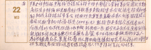 此為吳三連寫於 1978 年 3 月 22 日之日記。早間吳三連主持南紡常董會,討論大貿易商投資一事,因南紡借款甚多,議決不多投資,僅投 600 萬。後繼續召開環球常董會,侯雨利、吳尊賢、吳憲藏等皆出席,會上議決投資 1000 萬。會議結束後赴國泰綜合醫院探望李菱並在院內用餐,餐畢前往大直向謝東閔道賀其當選副總統。晚間慶祝李菱生日,特自醫院請假返家。   本日記所記述的時間點正為第六屆副總統選舉當日,前一日為總統選舉。蔣經國在自己受提名為總統候選人後向二中全會書面建議,提名謝東閔作第六任副總統候選人。因吳三連四子吳俊民之妻謝式如為謝東閔之姪女,謝家與吳家兩族關係緊密,使吳三連對其輔選出錢出力,並透過自己前國大代表以及工商、本土、黨外大老的身分,聯絡各樣關係替謝東閔之同額競選助拳。最終,謝東閔於國民大會的 1189 位代表中獲得 941 票支持,高票當選。