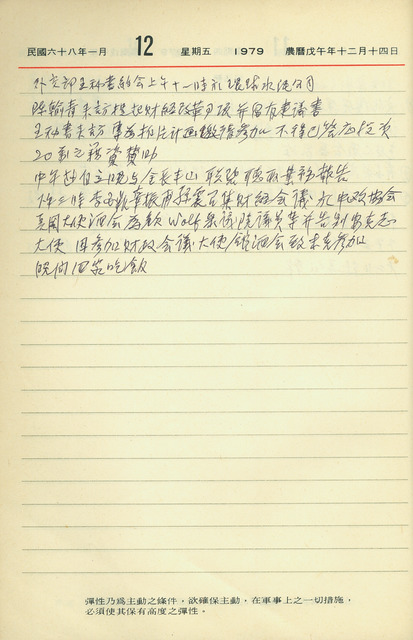 此係吳三連寫於1979年1月12日之日記。當日吳三連與外交部王秘書有約,另外有陳漢青來訪,提到財經改革並留下建議書;之後去自立晚報聽取吳豐山等人報告,下午去中歐協會出席李國鼎等人召開之財經會議。   本篇日記中提到吳三連出席李國鼎、辜振甫等人召集的財經會議,李國鼎曾任經濟部長、財政部長;辜振甫則是自台灣知名企業家,經營台灣水泥、中信集團等;吳三連自身亦是企業家,可見與會之人均是相關領域之人士。因李國鼎擔任1979年7月成立的資訊工業策進會董事長,推動資訊工業的發展,推測此次財經會議除討論財政問題外,可能與此事有關。
