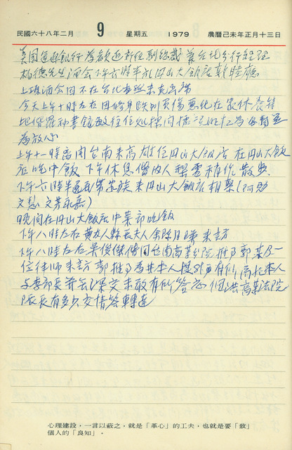 此係吳三連寫於1979年2月9日之日記。當日吳三連早上去探望吳修齊,之後自臺南前往高雄,晚上與家人團聚用餐。晚上有余陳月瑛及吳俊傑等人來訪。表定之美國運通銀行酒會因不在臺北而未出席。   吳三連在政商界交友廣闊,因此時常受邀出席酒會、宴會等,當日若無特別事情或時間衝突幾乎都會出席參加,當日表定之酒會則因其不在台北而未出席。此外在其日記中亦常見訪客因事來拜訪吳三連,多半是與求職、解決司法糾紛之事、人際關係有關,別人的請託吳三連通常都會答應協助,但也表明若是事情很難處理仍會盡力轉達但不保證能夠成功。