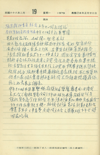 此係吳三連寫於1979年2月19日之日記。當日有張寶樹來訪,說明余登發案件之事,並提起蔣經國有意提拔吳三連作為資政,但吳三連本人以已受聘為國策顧問婉拒。中午在聚豐樓招帶記者用餐,報告關於南聯國際貿易公司成立之事。下午與陳樸一、林伯欣討論南聯國際貿易公司之事務。   本篇日記提到之張寶樹,其時任國民黨中央委員會祕書長,此次到訪有兩件事,其一是向吳三連說明余登發一案並非政治迫害,是依據犯人吳春發(即吳泰安)提及之事實檢舉並逮捕之;另外則是總統蔣經國有意提拔吳三連作為資政,但吳三連以已受聘為國策顧問婉拒之。關於張寶樹提到余登發一案並非政治迫害一事,應是指在余登發與其子被捕後黨外人士為其聲援,並指稱此事是政治迫害的橋頭事件一事;另余登發的兒媳余陳月瑛與女婿黃友仁在案發後時常拜訪吳三連請求協助,可能與當日張寶樹來拜訪一事有關。