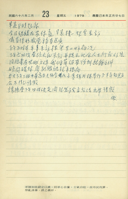 此係吳三連寫於1979年2月23日之日記。當日吳三連仍待在家中休養。下午有蔡培火、廖副總經理等人來訪。因身體不適而未出席中華民國高爾夫協會理監事會、讓德堂理監事會。   當日因吳三連感冒身體不適繼續在家中休養,因此表定的中華高爾夫協會理監事會、讓德堂理監事會均未出席參加。在吳三連日記中時常可見其出席宴會、公司董事會等紀錄,若無其他事情或時間衝突幾乎都會出席參加,可見其十分重視人際關係之交往與公司經營之事。另當日尚有蔡培火、女婿陳樸一與女兒吳梨雪等人來訪探望。