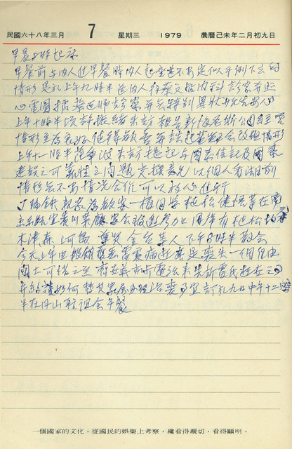 此係吳三連寫於1979年3月7日之日記。當日早上吳三連接獲雷震病逝之消息,並與齊世英相約討論如何協助家屬辦理治喪事宜。早上許振緒來訪,報告新海瓦斯公司經營情形;之後范爭波來訪,提起與國泰信託及國泰建設之合作問題。晚上吳三連去參加丁瑞鉠之宴會。   雷震於1949年創辦《自由中國》雜誌,批評國民黨一黨專政,並與臺灣本土的反對派合作推動不分省籍的反對黨運動。為了貫徹民主政治理念,1960年雷震結合臺灣地方領袖高玉樹、楊金虎、郭雨新、李萬居、余登發和民社黨、青年黨人士,醞釀籌組「中國民主黨」,並投入地方選舉,同年9月與《自由中國》的編輯傅正等人被以「知匪不報」、「為匪宣傳」罪名逮捕,雷震被判處有期徒刑十年。籌組中國民主黨時吳三連曾名列召集人之一,但之後因「來自掌權當權當局的高壓」,未能持續參加。