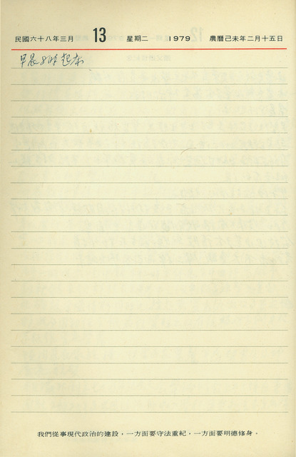 此係吳三連寫於吳三連寫於1979年3月13日之日記。當日僅紀錄早上八點起床。