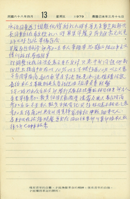 此係吳三連寫於1979年4月13日之日記。當日早上吳三連與水泥同業拜訪汪彝定,商討關於水泥價格之事。下午如水會臺北支部舉行大屋盃比賽,吳三連原本準備要去參加,但因下雨未能參加,只過去表示歡迎之意,晚上在圓山俱樂部招待參加者用餐。   關於日記中提到的如水會,是一橋大學之校友會,成立於1889年3月,舊稱「高等商業學校同窗會」、「日本高等商業學校同窗會」,於1914年11月14日舉辦之創立總會上正式更名為「如水會」,後於1916年8月10日正式由文部大臣批准成立為社團法人。如水會之主要宗旨為「支援母校」,幫助母校一橋大學實踐其目標與使命,並促進政治經濟與社會文化之發展,並非僅是為了校友間的互相親睦而設立。吳三連畢業於一橋大學,亦加入如水會,在其日記中可見其參與如水會台北支部活動之紀錄。