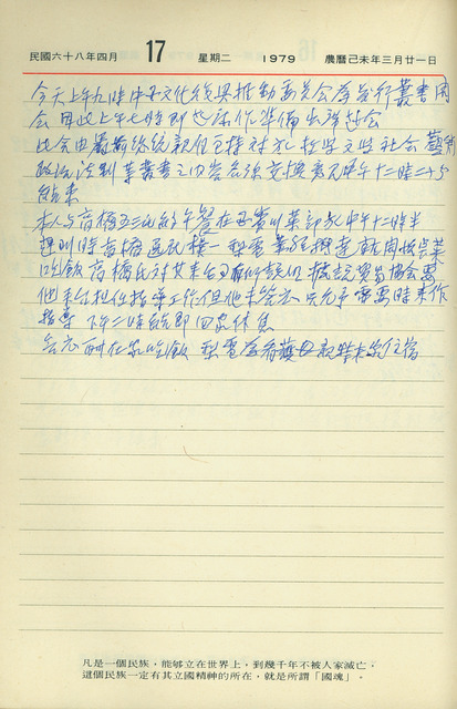 此係吳三連寫於1979年4月17日之日記。當日吳三連出席中國文化復興推動委員會會議,討論發行哲學、文學、社會等方面叢書之內容;中午則與高橋五三氏等人在國賓大飯店有約,一同共進午餐。   關於本篇日記提到之中華文化復興運動推行委員會,簡稱文復會。1960年代中期中華民國代表中國的正當性漸受質疑,恰逢1966年中國發動文化大革命,國民政府便以維護法統為名推動中華文化復興運動。1967年成立中華文化復興運動推行委員會,擬訂運動推行綱要,以「提高倫理道德,建設社會秩序」為重心,以推行「國民生活須知」與「國民禮儀典範」為首要工作,具體工作內容包含整理出版古籍、提倡戰鬥文義、推廣現代國民生活運動等。日記中提到之中華文化叢書為文復會召集相關學者重新編駐古籍並出版之計畫;另吳三連於1978年奉聘為該會之副會長,因此在其日記中可見其出席相關會議之紀錄。