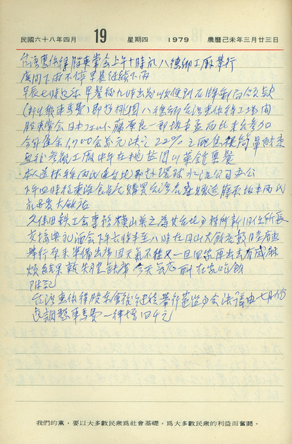 此係吳三連寫於1979年4月19日之日記。當日早上吳三連出席臺灣惠爾德股東常會,會中決定配息等事項;之後回到環球水泥公司辦公,下午去東洛食品店購買臺灣名產贈送日本友人;吳三連原定晚上要去圓山大飯店出席久保田鐵工會台北事務所新舊任所長交接典禮,但因天氣不佳未能出席。   吳三連在政商界交友廣闊,又其經營的事業版圖橫跨多個領域,因此在其日記中時常可見其出席相關會議或受邀出席宴會等活動,可從其出席的會議或宴會中推敲其人際網絡與經營事業;另因其與日本伊藤忠商事株式會社、日本惠爾德株式會社有合作之故,亦常有日方派人來台出席股東會等,吳三連多半會贈送禮品或請他們吃飯,表達歡迎之意。