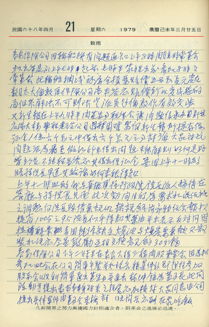 此係吳三連寫於1979年4月21日之日記。當日早上吳三連出席泰安產物保險公司臨時常務董事會,商討輪船擱淺的賠償問題。之後出席新生報董監事聯席會議,因承辦新生廣場大樓的華聯建設公司周轉困難,需要向新生報提存保證金,但此事嚴重不能輕易答應。接著吳三連與辜振甫按照約定前往行政院與孫運璿院長見面,以水泥價格調整之事向孫運璿陳情兼說明。下午泰安產物保險公司召開股東常會,選出董監事、董事長。   關於本篇日記中提到吳三連與辜振甫去行政院拜訪時任行政院長的孫運璿報告水泥價格調整之事,因是指1979年4月底政府單位許可水泥價格調漲之事。在吳三連先前的日記中曾提過他與其他水泥業者開會商討水泥價格調整之事,此事是受第二次石油危機影響,導致燃料油與包裝成本提高外,尚有勞動工資提高之故,水泥業者提出漲價的要求,據報導指出,原先水泥業者打算採取更換包裝並調整價格的方式進行,由原先的50公斤裝改為40公斤之新包裝,但主管機關認為此舉容易讓消費者認為有變相漲價之嫌,此外採用新包裝可能會增加成本和人工,因此最後撤銷更換包裝案,改由調整價格的方式進行,經經濟部核定後同意水泥出廠價格提高約一成。