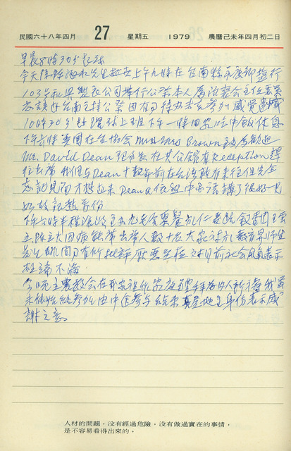 此係吳三連寫於1979年4月27日之日記。當日早上是陳海水逝世公祭,但吳三連有事未能參加主持公祭。晚上美國在臺協會的Mr.& Mrs. Brown主辦歡迎宴會,吳三連在結束後去參加程滄波主辦之九老會聚餐,晚上有立農教會在家中作家庭禮拜。