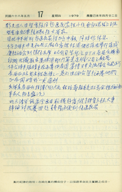 此係吳三連寫於1979年5月17日之日記。當日吳三連下午出席中美和化工廠高雄林園地區落成慶祝酒會,晚上在國賓四春園參加張晴來宴請西山昭之宴會。   吳三連日記的內容記述多以其行程或日常生活為主,其平日多到環球水泥公司辦公,期間會有友人或秘書等人來訪,向其報告公司相關業務或有事相商。另吳三連在政商界交友廣闊,時常受邀出席宴會或慶祝酒會,如當日受邀出席中美和化工廠的落成慶祝酒會,因該工廠出產之TA產品台南紡織化纖廠需要,吳三連做為公司客戶特地前去捧場。