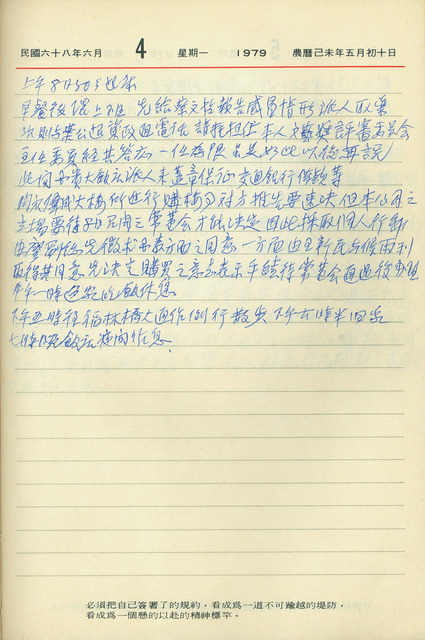 此係吳三連寫於1979年6月4日之日記。當日吳三連早上到環球水泥公司上班,與葉公超通電話,請葉公超擔任吳三連文藝獎評審委員會主任委員,葉公超答應以一任為限。之後有國賓大飯店派人來蓋章保證借款,並處理偉成大樓購樓之事。   日記中提到的吳三連獎屬終身成就獎,是民間性的獎項,主要頒發給在個獎項領域內有傑出成就、繼續創造潛力,並認同臺灣之人士或團體。在吳三連先前的日記中曾提過源先擔任文藝獎評審會主任委員的陶百川因將赴美旅行,而向吳三連請辭主委一職,因此吳三連先前曾拜託葉公超接任評審會主委一職,葉公超原先婉拒但在吳三連的堅持之下仍同意擔任。