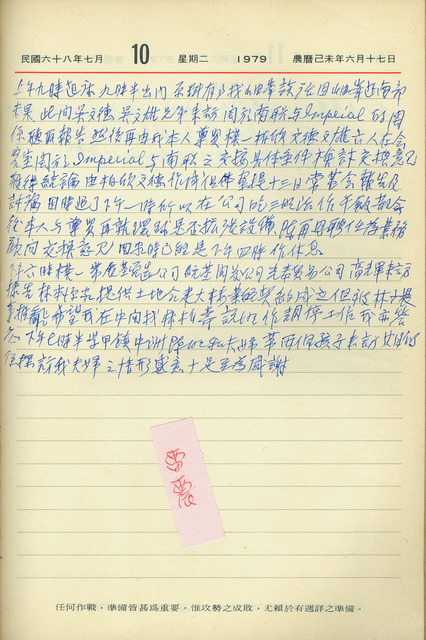 此係吳三連寫於1979年7月10日之日記。當日吳三連早上到南聯國際貿易公司聽取報告,之後在與吳尊賢等人討論交接之具體條件。會議結束後再與吳尊賢討論環球水泥公司是否擴張設備等事情。晚上陳樸一、陳明和夫婦來拜訪。   關於本篇日記提到南聯國際貿易公司與Imperial交接之事,應與南聯國際貿易公司的美國分公司有關,南聯公司於1980年先後於美國德拉威州與加利福尼亞州登記設立「南聯國際貿易(美國)股份有限公司(簡稱南聯美國公司)」與「南聯美國公司洛杉磯分公司」,並由吳文德擔任洛杉磯分公司負責人,但之後因面臨重大虧損而倒閉。