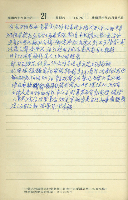此係吳三連寫於1979年7月21日之日記。當日吳三連早上到環球水泥公司上班,之後參加學人座談會。趙富鎰打電話來,說楊縣長來訪,是有關洪通住宅用地之事。8月3日由自立晚報主辦之鹽分地帶文學活動邀請吳三連參加,但因同日有環球水泥公司之董監事會議,只能放棄出席鹽分地帶文學活動。   關於日記中提到的鹽分地帶文藝營,於1979年8月3日舉辦第一屆。由當時在自立晚報副刊任職的杜文靖與友人羊子喬、黃勁連等人共同籌辦,希望能延續南瀛文學的傳承,請吳三連出任營主任,自立晚報社長李雅樵出任營副主任。1983年第五屆鹽分地帶文藝營結束後,由吳豐山提議應推舉籌備委員專門負責每一屆的籌備事宜,亦決定由自立晚報接手,負責籌備募款。1994年8月,因為自立晚報經營不善、連連虧損,不得不將經營權轉讓,之後決定由吳三連臺灣史料基金會負責接手,繼續籌辦鹽分地帶文藝營。