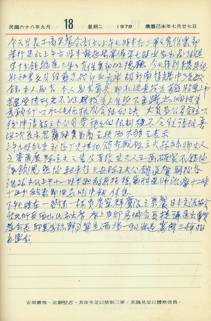 此係吳三連寫於1979年9月18日之日記。當日早上吳三連出席工商早餐會,在會中踴躍發言。結束後吳三連去歷史博物館參觀陳立夫、孫綠卿夫人之書畫展。晚上出席群鷹隊之聚餐,在宴席上由邱秀城會長提議選吳尊賢作為新任會長,滿場一致通過。   日記中提到的工商早餐會,由中華民國工商協進會主辦,主要目的為聚集商界人士與政府官員共同商討國內外經濟議題,並反應企業界的現況提供政府作為施政參考,吳三連是該會常客之一。當日之會議中,吳三連提到兩件事,第一水泥業當前投資金額甚鉅,股票上市後若營運狀況不好會影響投資人的投資意願,所以水泥價格必須要有合理的決議;第二則是關於大貿易商公司要成立分公司的諸多限制並不合理,希望改善之。關於第二向提到之大貿易商公司成立分公司之事,應與南聯國際貿易公司籌組美國分公司之事有關。