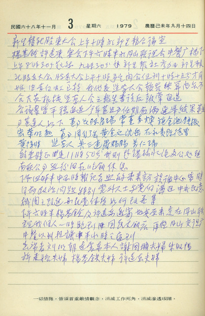 此係吳三連寫於1979年11月3日之日記。當日早上吳三連到新生報社參加股東大會,會議報告決算通過,之後選舉新任董監事,結束後吳三連回到環球水泥公司辦公。下午中國時報記者來訪,討論目前的政治問題,如黨外人士與黨的溝通、中央民意機關之改進與國民黨體質如何改善等。晚上出席楊基銓和許遠東舉辦之宴會。   關於朝野溝通一事,源自於1970年代世界局勢驟變,1978年底美國宣布與中華民國斷交、與中華人民共和國建交,當年度之增額中央民意代表選舉也因此停辦,此舉引發黨外人士的不滿,與執政黨之間的衝突不斷,為使社會安定和諧,由吳三連出面負責邀請國民黨官員與黨外人士一同參加餐會,一共進行四次朝野溝通餐會,到底此舉成效如何不僅備受政界人士關注,在立法院總質詢時亦有不少立委對此提出疑問,時任國民黨中央政策委員會副秘書長關中則表示雙方願意坐下來談話已是重要的進展,雙方藉由溝通了解彼此的意見與難處,對於未來之改革也會聽取建議逐步展開。