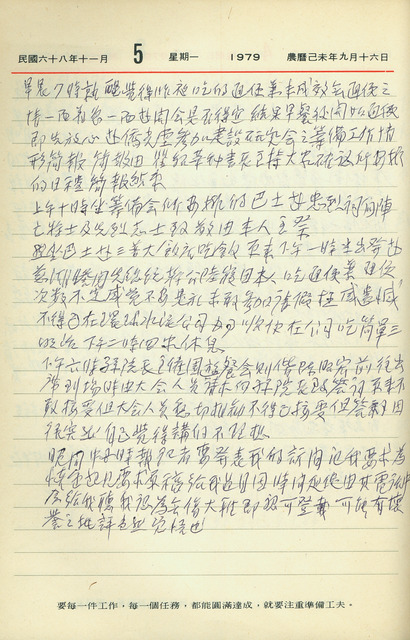 此係吳三連寫於1979年11月5日之日記。當日早上吳三連到僑光堂參加建設研究會之籌備工作情形簡報,之後坐巴士到忠烈祠向陣亡將士及先烈志士致敬,由吳三連主祭。原定下午要去慈湖瞻仰先總統蔣中正之陵寢,但因身體不適未參加,回到環球水泥公司辦公。晚上與陳昭宏一同出席孫運璿主持之園遊餐會。晚上則有中國時報記者要發表之前吳三連的訪問稿,吳三連要求先讓他過目確認無誤後再刊登。   日記中提到的建設研究會指的是國家建設研究會,簡稱國建會。因應1970年代國際局勢驟變,中華民國退出聯合國、中國對外打壓中華民國等衝擊,中華民國政府號召海內外同胞團結,召開以海外學者專家為主的國建會,於1972首次舉辦,之後逐年召開。1978年美國宣布與中國建交、不承認中華民國,為因應時局之變化,改由行政院主持,增列政治與外交課題。1983年以後國建會討論內容逐漸偏向科技發展、文化建設及經濟建設等具體政策。