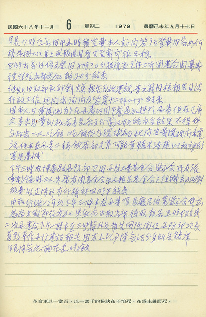 此係吳三連寫於1979年11月6日之日記。當日早上吳三連到僑光堂參加第二次國建會開幕典禮,由邱創煥、李元簇報告。中午與黃鳳池約在國賓大飯店吃午餐,但因弄錯地點而未能一同吃飯。下午出席國防部召開之國防工業基金會監事會,對於基金會組織辦事細則及經費收支情形有所檢討。接著出席中和紡織公司之董監事會議。   日記中提到的國防工業發展基金會與國家建設研究相同,在1970年代國際政治局勢驟變後成立。1978年美國宣布與中國建交、與中華民國斷交,並廢止共同防禦條約,中華民國面臨重大外交挫折,民眾發起自強救國捐獻,1979年元旦時立法通過將全民捐款作為「財團法人國防工業發展基金」,由該基金會之董事會負責將該筆資金及政府預算進行統籌管理,並將之運用於重要武器裝備之研發,以及其他國防相關科技工業水準提升之計畫中。