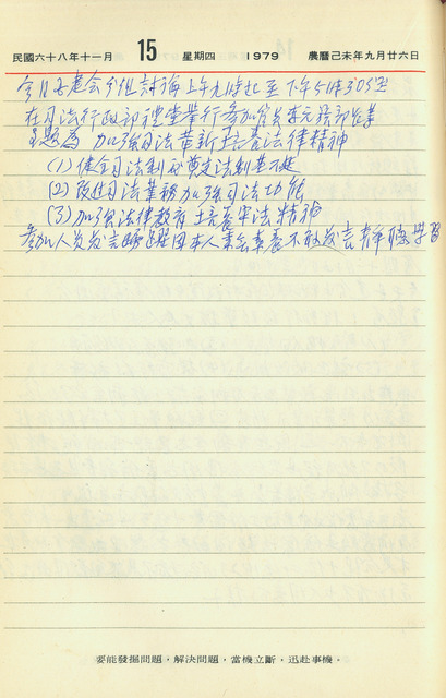 此係吳三連寫於1979年11月15日之日記。當日早上吳三連出席國家建設研究會之會議,主題是「加強司法革新培養法律精神」,有官員李元簇等人參加。   本篇日記中提到的國家建設研究會簡稱國建會,是因應1970年代國際局勢驟變,中華民國政府召開以海外學者專家為主的國建會,分成各項主題進行討論,如司法、教育、財經等,於1972首次舉辦,之後逐年召開。吳三連於當日出席司法組的討論,會議主題為加強司法革新並培養法律精神,與會人員發言踴躍,吳三連則謙虛表示對此議題不熟悉並未發言。