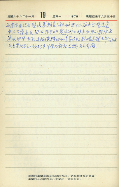 此係吳三連寫於1979年11月19日之日記。當日早上吳三連參加國建會座談會暨閉幕典禮,中午與齊世英、田雨時約吃午餐。晚上參加吳李宗與陳美愛知結婚喜筵。   吳三連作為國策顧問,對於國家建設研究會(國建會)的會議十分上心,在其近期的日記中時常可見其出席相關會議之紀錄,當日則提到他出席國建會座談會祭閉幕典禮。此次國建會會議題出不少建言,包含公營企業轉型問題、工業污染防治、能源問題、科技發展、銀行開放民營等問題,吳三連亦在會議中發言表達意見,如選舉改革、稅收問題等。