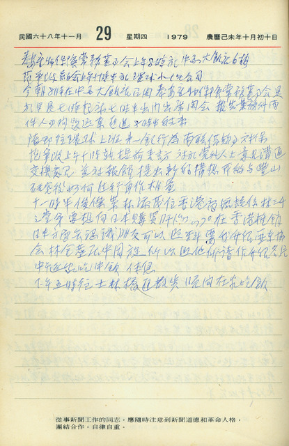 此係吳三連寫於1979年11月29日之日記。當日早上吳三連出席泰安產物保險公司常務董事會,會議內容包含業務報告以及人事問題,照案通過。之後回到環球水泥公司上班,范爭波來訪,對於黨外人士意見溝通和吳三連交換意見,並對報館提出新的構想,吳三連表示與吳豐山研究後再商量。   吳三連在政商界交友廣闊,因此時常有人來拜訪,請託他幫忙,如協調糾紛、投資等,此外因其身間樹間公司之董事、監事職務,時常可見他出席各公司之會議,並結識不少黨外人士與官員,在1970年代的台灣社會內部開始出現變化,吳三連作為中間人邀請黨外人士與國民黨官員進行意見交流與溝通,此次朝野協調亦備受各界矚目,在吳三連日記中亦曾多次提到宗親會、九老會等聚會的時後有人向他問起此事。