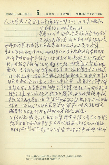 此係吳三連寫於1979年12月6日之日記。當日早上吳三連出席東亞工商企業者會議,台、日雙方各有代表報告,許金德報告觀光事業之開發,最後由辜振甫發表聲明。中午有海原氏之演講,但吳三連回到環球水泥公司辦公所以缺席。晚上出席瀨島氏之宴會。   日記中提到吳三連出席東亞工商企業者會議,該會議是因1972年中華民國與日本斷交,台、日兩國工商界為維持雙邊經貿關係,於1973年召開第一次東亞經濟會議,由台灣工商協進會與日本經濟團體輪流在台北和東京兩地舉行會議。本次會議中主要討論兩國之間如何進行平衡貿易,另中華民國方面提到促請日方改善簽證辦法、協助我國訓練技術人員,以及日本大商社可與我國大貿易商尋求合作途徑,並解除對我國的農產品限制以供出口等事項。