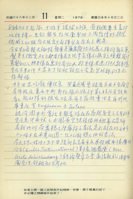 此係吳三連寫於1979年12月11日之日記。當日為美麗島事件發生之隔日,吳三連寫到早上各家報紙均有大篇幅報導美麗島雜誌社與憲警衝突之事。晚上關中打電話給吳三連,報告前一天晚上在高雄之事件,希望吳三連提供協助,吳三連認為要了解真相尚須聽聽別人的看法,於是約康寧祥明日一同吃飯。下午原本受邀出席由張光世主辦之頒獎典禮,但因身體不適缺席。   1979年12月10日,美麗島雜誌社於高雄舉辦人權紀念會,吸引大批群眾參加,治安單位派出大批鎮暴部隊進行嚴密監視,最後導致場面失控,警民爆發嚴重衝突,警備總部隨後以叛亂罪嫌逮捕參與活動的相關人士,並進行軍法審判,係為「美麗島事件」。事件發生後加速台灣社會內部本土化與民主化的進程,長期由國民黨一黨專政之政治體制亦開始出現變化,同時,事件後黃信介、姚嘉文、林義雄等受刑人為抗議國民黨不當審判,在獄中進行絕食抗議,受刑人家屬與台灣各界亦在獄外聲援絕食活動,從吳三連日記中可見其為營救美麗島事件受刑人多方奔走連繫之記載。