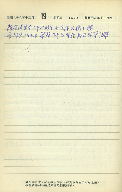 此係吳三連寫於1979年12月19日日記。本日傍晚6點有陳啟清宴會,以及6點半的蔡培火聚餐,因吳三連是以年曆手冊書寫日記,故其日記記載方式為,先記載每日行程至當日再將當天的行程書寫下來,如本日有記載預定出席舊人會聚餐及陳啟清之宴會,但因沒有寫日記,故而當晚是去赴誰的宴會並不清楚。吳三連的日記內容多以其平日處理公務、出席會議或宴會之行程為主,除了舊人會之外,吳三連亦參與其他由政商界大佬組成之聚會,如慶生會、九老會等,透過日記之記述,可推知這政商界大老經常透過定期聚餐的方式聯繫情誼,吳三連亦時常出席相關之宴席。   本日日記提及的蔡培火與吳三連為同時代的人物,兩人在1920年代都扮演重要角色,他一生活躍於殖民統治的日治時期,而於威權統治的國民黨時代沈潛。在日治時期致力於台灣議會設置請願、台灣文化協會、台灣民眾黨、台灣地方自治聯盟等政治運動;協助發展台灣人的刊物報紙《台灣青年》、《台灣民報》、《台灣新民報》;為了改良台灣語言的缺點與複雜,用羅馬字拼音的白話字來解決台語發音和書寫的問題並熱心推行白話字運動;不是學音樂的他,因喜歡作詞及譜曲,而譜成多首以台灣人文化生活為主題的歌曲,如:「咱台灣」、「台灣自治歌」、「基督青年會歌」、「霧峰一新會會歌」等等作品。他於1937年舉家赴日後,在伊勢丹百貨公司附近開設「味仙」餐廳,是許多在日台灣人或留學生經常聚會的地點,吳三連也曾與關心米管案的相關人士於1939年6月在味仙聚餐並合影留念。作曲家呂泉生也回憶他在東京留學時,經常受到蔡培火的照顧與招待,他在味仙餐廳最常吃到的就是米粉湯,是他最懷念的滋味。戰後蔡培火加入國民黨,成為國民黨籠絡台灣人的象徵,然位高卻無權,無法舒展抱負,相較於日治時期,光芒已失。