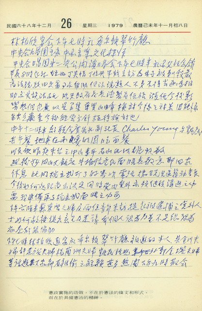 此係吳三連寫於1979年12月25日之日記。當天早上有丁吳惜、丁佳興來訪,為其子被刺殺之案被最高法院駁會更省之事來尋求吳三連協助。接著吳三連找吳尊賢、顏岫峰來開會商討對於油製品價格漲價之對策,尤其能源嚴重缺乏,必須檢討今後之經營方針。傍晚蘇東起夫婦來訪,提起如何救援被逮捕的黨外人士之事,吳三連認為自己力量不足,但會盡其所能。晚上則出席林柏欣之宴會。   1979年12月10日美麗島事件發生後引起台灣各界高度重視,各界人士亦紛紛前來拜訪吳三連,討論事件對策,亦有美麗島受刑人家來訪尋求救援。接續前一日日記(1979年12月25日)之事項,杭立武據說已拜會蔣彥士,但尚未決定如何處理,蘇東啟夫婦亦來訪,提出救援被捕之黨外人士的意見。