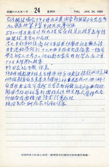 本篇為吳三連 1980 年 1 月 24 日之日記,當日早上吳三連出席臺灣排球協會常務理監事會,通過預算案並決定比賽計畫,因與吳金川約在環球水泥公司見面而提早離開敢回環球公司,其來訪目的是一橋大學同學露木清來臺,邀請吳三連等同學出席宴會,吳三連答應出席。下午有城教授夫婦與呂律師姊弟等人來訪,因其姊呂秀蓮在美麗島事件中被捕,希望吳三連能協助脫困,吳三連表示會盡力而為,亦表示該事件之審判將影響臺灣甚鉅,需向相關單位請求從寬處理。   1979年12月10日美麗島雜誌社於高雄舉辦人權紀念會,吸引大批群眾參加,治安單位派出大批鎮暴部隊進行嚴密監視,最後導致場面失控,警民爆發嚴重衝突,警備總部隨後以叛亂罪嫌逮捕參與活動的相關人士,並進行軍法審判,係為「美麗島事件」。該案於1980年3月18日召開軍事法庭審理黃信介、陳菊等八名被告,因該案備受國內外囑目,因此不得不採取公開審理的方式,是軍事審判中少數的例外。亦因為是公開審理之故,該事件中被告的政治理念得以透過媒體宣揚給大眾,化解民眾對美麗島事件是暴動的誤會,對於黨外勢力的發展有其重要性。