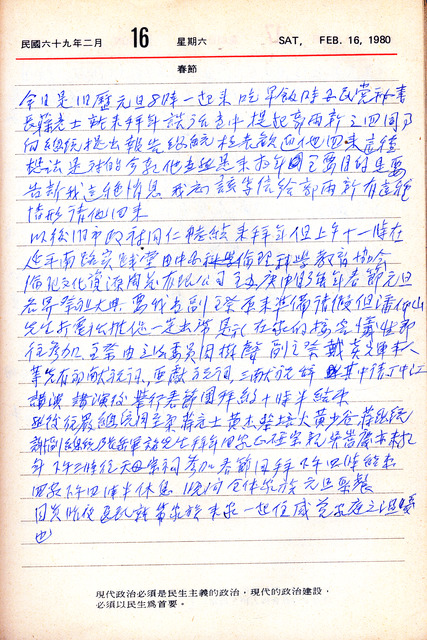 本篇為吳三連 1980 年 2 月 16 日之日記,當日是農曆初一,許多友人來吳三連家中拜年,早上蔣彥士來拜年時提起向總統報告郭雨新回國之事,總統表示歡迎,吳三連表示會寫信給他。之後吳三連出席中國倫理科學教育協會、倫理文化資源開發有限公司主辦之祭祖大典,擔任副主祭。結束後去友人家中拜年,晚上在家中與家人聚餐。   郭雨新,為臺灣政壇早年活躍的黨外人士,與吳三連、李萬居、許世賢、郭國基、李源棧等被譽為省議會的「五龍一鳳」。1960年因參與中國民主黨組黨運動而成為當局的眼中釘,後於1975年因遭國民黨作票而落選立委,最後於1977年來開臺灣旅居美國。於1979年成立臺灣民主運動海外同盟,終其一生致力於海外臺灣政治民主化運動的推行。