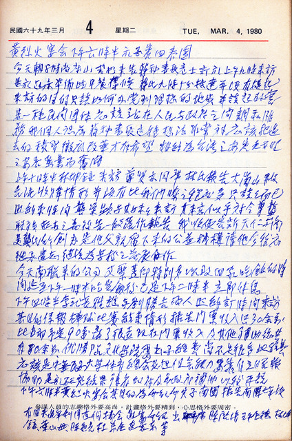 本篇為吳三連 1980 年 3 月 4 日之日記,當日上午蔣彥士來訪,與吳三連談起政黨的理想,之後林坤鐘來訪,像吳三連報告大崗山被臺灣水泥收購之事。之後龔榮顯與其妹照約定時間來拜訪,向吳三連報告其父龔聯禎逝世善後已告一段落,吳三連則告訴他天仁工商是其父所創辦,應繼承其遺志繼續發展學校。下午李雅樵與劉勝吉來訪,報告自立杯棒球比賽結束之事以及經費問題;晚上吳三連出席黃烈火之宴會。   當日吳三連事務繁多,有蔣彥士、林坤鐘、龔榮顯、李雅樵等人因事拜訪,會談中談及大崗山被臺灣水泥收購、自立杯棒球比賽的門票收益問題等。