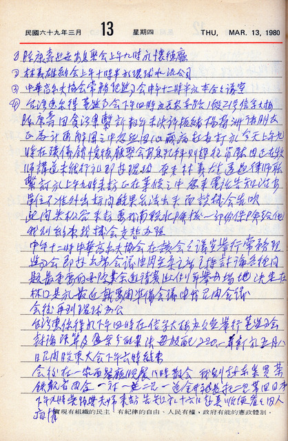 本篇為吳三連 1980 年 3 月 13 日之日記,當日上午吳三連出席陳康壽安息禮拜,結束後返回環球水泥公司。原本與林義雄有約,但林義雄來電告知治安單位不准其外出訪問,因此取消會談。之後吳三連出席中華民國高爾夫協會常務理監事會議、臺灣惠爾得公司董監事會議;晚上吳物典夫婦來訪,告知將於16日去美國,順便探望李菱病情。   關於本篇日記提到之陳康壽,其曾任臺灣省政府建設廳公共工程局副局長,1975年時曾因涉嫌臺北縣永和鎮都市計劃中收受紅包被移送法辦,此案件應為日記中提到之貪汙案件。
