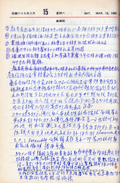 本篇為吳三連寫於1980年3月15日之日記。當日上午吳三連出席泰安產物保險公司常務董事會,討論國外進口業務等事項;之後吳三連與邱永漢代表人黃堤塘約在環球水泥公司見面,吳三連表示難以勝任後援會長一職;會面結束後臨時與蔣彥士有約,便去國民黨中央黨部與蔣彥士見面,吳三連將林義雄之被忘錄交給蔣彥士,表示刑求不可寬恕;中午與李廉、丁中江聚餐,未趕上顏春安之告別禮拜;晚上則出席慶生會聚會。   關於本篇日記中提到之林義雄備忘錄,在康寧祥的回憶錄《臺灣,打拼:康寧祥回憶錄》中提到,林義雄於1980年2月25日寫下備忘錄,詳細紀錄其在美麗島事件後被送到警總保安處時受到的刑求逼供與疲勞審訊之過程。前一日之日記中康寧祥告訴備忘錄的內容,於是本篇日記中便紀錄吳三連去找蔣彥士說明此事,表示難以寬恕刑求之舉。
