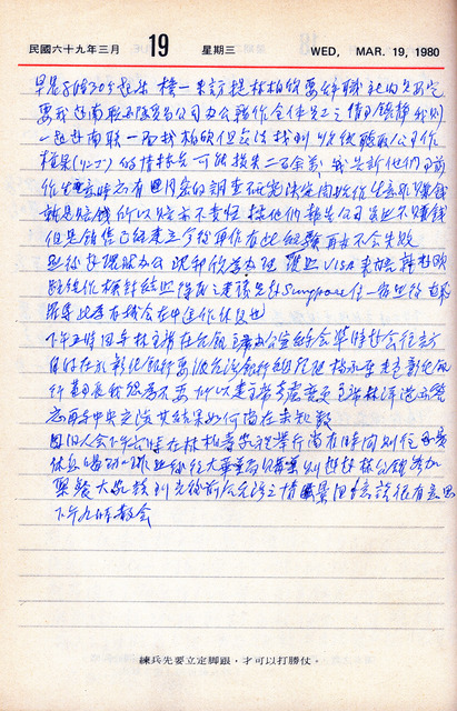 本篇為吳三連寫於1980年3月19日之日記。當日上午陳樸一到訪提起林柏欣辭職一事,希望吳三連可以到南聯國際貿易公司辦公、勉勵員工,藉此穩定員工情緒。之後吳三連回到環球水泥公司辦公,沈邦頎為辦理護照之事來晤,並討論去歐洲的路線規劃;之後與林洋港在臺灣銀行主席辦公室有約,吳三連建議重新考慮讓楊承厚接任彰化銀行董事長之事;晚上則出席在林柏壽家中舉辦的舊人會聚餐。   關於本篇日記中提到陳樸一邀請吳三連到南聯國際貿易公司辦公穩定公司員工情緒一事,除了日記中提到總經理林柏欣請辭之外,尚有其公司業績不佳之影響,於是吳三連便到南聯國際貿易公司中勉勵員工。先前吳三連曾於日記中提到打算在工商早餐會中向時任國貿局長的邵學錕提起大貿易商經營困難之問題,亦與此有關。