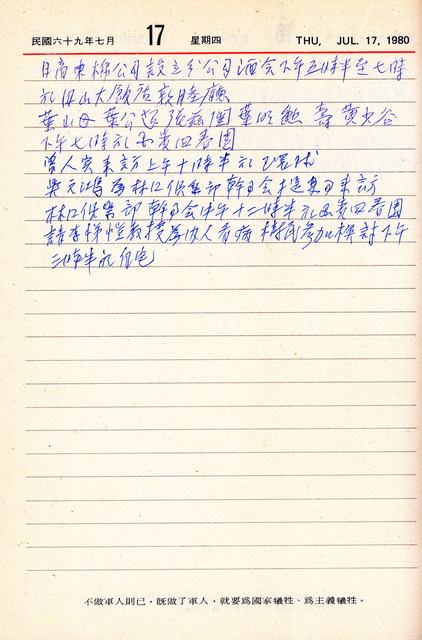 此為吳三連寫於1980年7月17日日記,上午曾人實赴環球找吳三連、吳文鴻針為林口俱樂部幹事會提案來訪,中午出席林口聚樂部幹事會會議、下午由於吳三連請李悌愷醫師來家中替李菱看病、傍晚出席日商東棉公司設立分公司酒會以及與葉山母、葉公超、張茲闓等人的聚會。  1963年春,吳三連卸任臺北市長,發起籌設「林口高爾夫俱樂部」,邀請許金德、謝成源、林燈、賴森林等人集資,選定在林口興建球場。並於1965年8月,通過經濟部核准開放營運。1985年更名為「林口育樂事業股份有限公司」、發行股票,為國內少數擁有股票並有球場產權的股東設置。  葉山母、葉公超、張茲闓、葉明勳、黃少谷等人皆為該時期的政、商、報業界人士,葉公超曾擔任聯合國第九屆大會首席全權代表1961被免職後先後轉任行政院政務委員、總統府資政等,張茲闓為曾任經濟部長、台銀董事長,葉明勳曾任中央通訊社社長,逝世前任世新大學董事長,其畢生積極投入新聞傳播與教育之工作,並參與台灣最高的廣告公司,聯廣公司的創立,而黃少谷則曾任外交部長、政務委員、行政院副院長、司法院長等職務。