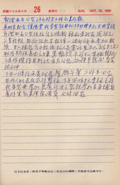 此為吳三連寫於1980年10月26日記,上午,吳三連出席郭澄逝世公祭,公祭結束後前往自立晚報,並討論台中縣地政人員貪汙案報導一事;下午前往國賓阿眉餐廳午餐後送妻子到長子逸民家暫住;下午四時,吳三連前往吳氏宗祠主持秋季典並參加聚餐。  日記中所提到的郭澄為山西人,畢業於中國大學政治系,後任三青團山西支團部幹事長、國民黨山西省黨部副主任委員,戰後,跟隨國民政府來台,先後於中央改造委員會、中央政策委員會、國民大會、行政院研究發展考核委員會任職,亦擔任國民黨9至11屆中常委,從吳三連的日記中,我們可以發現其雖為戰後台籍菁英,卻是少數能與政界網路維持不錯關係的人士,出席黨政人士的各種活動場合,亦為吳三連日記中時常出現的行程。  又,吳三連參加公祭後,赴自立晚報社,與社員討論台中貪汙案一事,日記中,吳三連秉持客觀、中立的態度,認為被槍斃者的判決有失公允,且有矯枉過正之嫌,所以,自立晚報不需要追隨其他報紙過份讚揚將貪汙犯被槍斃一事,應持平報導此事的原委。