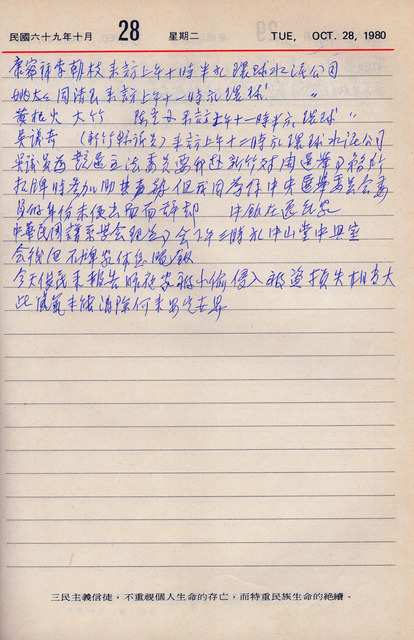 此為吳三連寫於1980年10月28日記,上午康寧祥、李朝枝、周清玉、黃根火、大竹、陳寶國等人分別來訪;吳議員因競選立法委員一事,希望吳三連出席幫其佔台以助聲勢,但吳三連因身兼中央選舉委員一職,不便出面,婉拒之;下午,出席中華民國譜系學會理監事會;聽聞長子吳逸民告知家中被小偷入侵一事對治安感到失望。  因吳三連為環球水泥股份有限公司董事長,所以許多會議以及會晤都在環球水泥公司進行。  另本日分別來訪的康寧祥、李朝枝、周清玉等人,可能與美麗島事件後續事宜有關,值得一提的是,周清玉為民主進步黨第二任黨主席姚嘉文之妻。早年主要從事社會服務工作,1979年姚嘉文因美麗島事件被捕入獄後,積極投入選舉活動。在1970年代,黨外人士紛紛鼓吹「訴求民主、解除戒嚴、解放黨禁、報禁」的呼聲下,姚嘉文積極投入司法改革,保障民權的工作上,除了與林義雄協助郭雨新打官司,獲得「黨外大護法」的美名外,1978年,姚嘉文出版「護法與變法」一書,欲推動國會全面改選,並打算參加國大代表選舉,後因參與1979年的美麗島事件,被以《懲治叛亂條例》起訴而入獄,事件發生後,周清玉四處尋求援助,除拜訪當時立委康寧祥外,亦尋求律師蘇貞昌、謝長廷等人協助,甚至千方百計連絡了AIT(美國在台協會)理事丁大衛,美麗島事件的發生,促使了周清玉代替丈夫參選國大代表及實現推動司法改革的目標,最後,於1980年國大代表增額補選中高票當選,步入政壇,之後成為彰化縣第一位女縣長。