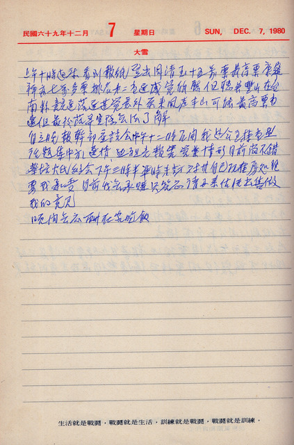 此為吳三連寫於1980年12月7日日記,吳三連上午起床後透過報紙得知該次選舉結果,並對於周清玉、康寧祥的當選感到欣慰,但對於吳豐山於台南縣競選落選甚感意外;中午,吳三連主持《自立晚報》幹部座談會,在幹部報告中聽聞營業情形目前尚不錯一事;下午,吳三連與蔡培火會面,討論蔡培火住房處理一事。  1978年12月,美國政府宣布與中華人民共和國建交並同時與我國斷交,時任總統的蔣經國動用緊急命令權宣布將至的國大代表、立委選舉延期,導致舉國上下譁然,直到1980年,之前被延期的選舉終於重啟;不過在這兩年中,卻發生了美麗島事件,當時黨外人士基於先前種種選舉弊案、言論箝制、黨禁、報禁的不滿,憤而辦美麗島雜誌,且於1979年12月10日世界人權日號召紀念與演講,然而在政府多方阻撓下,爆發了衝突事件,黨外人士不少人被警總逮捕、判刑,此事也於國內外造成不少輿論,1年後重啟的大選,這些人士的家屬以及黨外剩餘的菁英投入參選,且得票率可觀,如日記中所提的周清玉、康寧祥分別以第一、第二高票當選國大代表、立委。