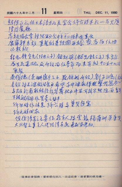 此為吳三連寫於1980年12月11日日記,中午,吳三連出席高爾夫協會常務理監事會;下午返家休息;傍晚與吳尊賢出席越俊正之、佐佐木清支店長宴會;林宗光、鈕則興來訪;吳俊德、劉子鴻為與中油取得聯繫一事來訪;康寧祥來訪,並預計下次約齊(齊世英)、高(高玉樹)聚餐。  日記中,可以看出吳三連人脈廣泛,不少人士前來請託其協助,如吳俊德、劉子鴻前來希望吳三連作為中介協助他們連絡中油,但吳三連認為這兩位青年不被視為買賣上的對手,所以中油很有可能置之不理,縱使如此,作為長輩的吳三連仍答應提供協助。  又,康寧祥來訪與吳三連約改天聚餐,並打算邀請齊世英、高玉樹等人一同參與,其中,吳三連、高玉樹、齊世英被康寧祥稱為《自由中國》時代五大老,雖然此時吳三連已退出政壇20餘年,但對於黨外人士仍十分關心,且與康寧祥、齊世英、高玉樹等人也時常藉由定期的便當會連繫與會面。