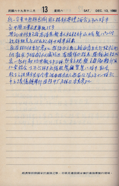 此為吳三連寫於1980年12月13日日記,上午,吳三連出席統一實業中壢麵包廠開工之典禮酒會,後赴林口俱樂部陪同越後正之打高爾夫;下午赴自立晚報主持編輯部同仁座談會;傍晚於僑聯餐廳聚餐吃飯。  日記中的統一實業創立於1969年,初名為「統一農畜股份有限公司」,專門從事雞、鴨養殖、加工處理、銷售等等,而後於台灣經濟起飛時期(1973-1984),採以多角化經營之政策,擴增公司經營領域,如;增設印鐵廠、製罐廠、角罐廠,並將公司更名為「統一實業股份有限公司」,將其專業自食品逐漸拓展至其他實業領域上,1994-2003年於台灣投資設立馬口鐵底片廠,並整合上、中、下游體系,將企業擴展至海外(越南、中國),至今為止,透過全球化的合作,該公司不僅於中國擴展製罐與馬口鐵生產線,亦與日本「大和製罐株式會社」合資設立鋁瓶罐包裝材料的生產、銷售基地,可足見其發展至今,配合全球化發展已成功跨多項實業領域。   又,統一企業的成立與台南幫息息相關,當時台南幫底下四大企業分別為台南紡織、環球水泥、統一企業、太子建設,台南幫中的吳修齊、高清愿在統一創立之初便分別擔任董事長、總經理等職,身為台南幫一份子的吳三連,亦時常出席相關企業重大活動。